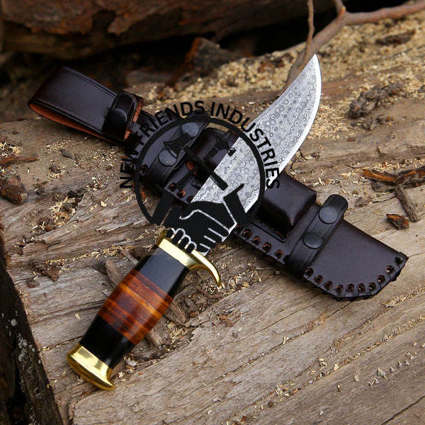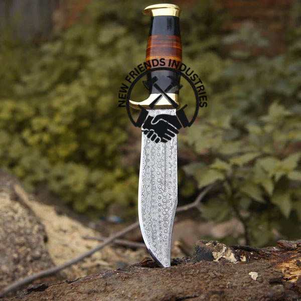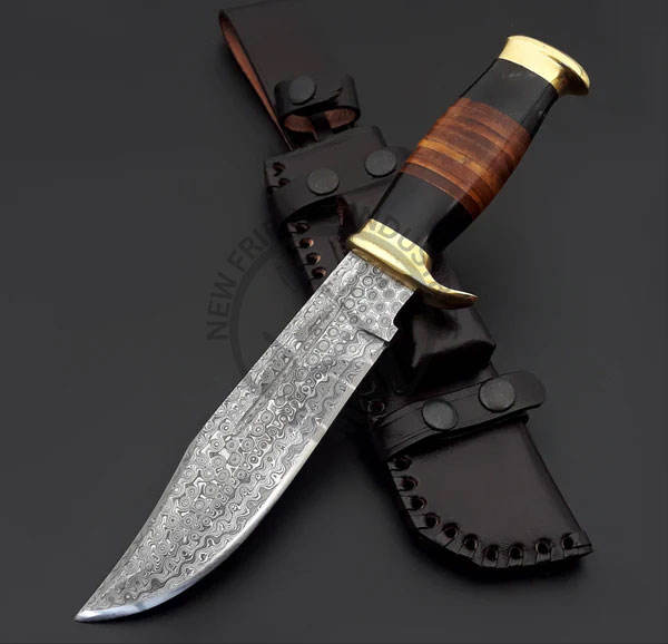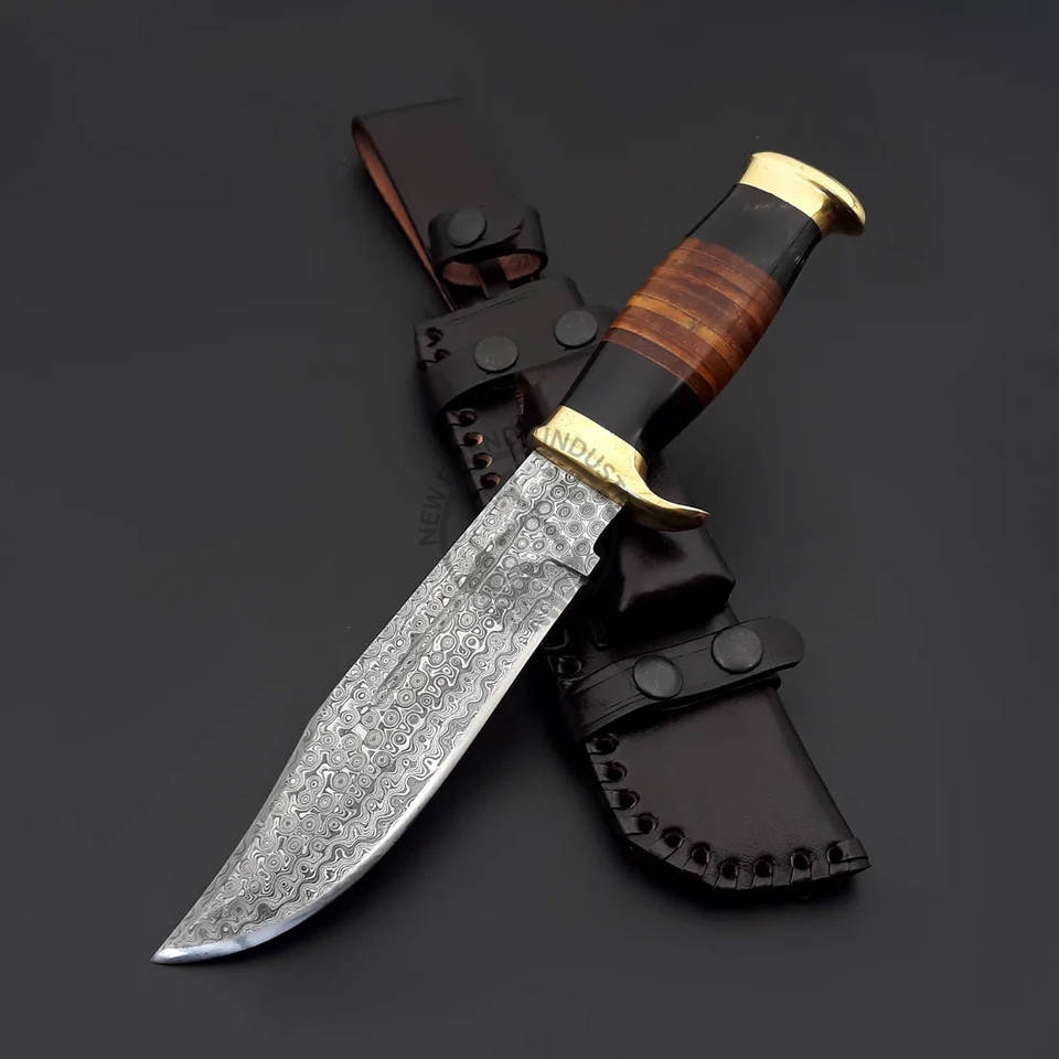 Handmade Custom 1095 Damascus 7" Blade Raindrop Surface Bowie Hunting Knife Sheath W/Bull Horn Stacked Leather Handle Brass