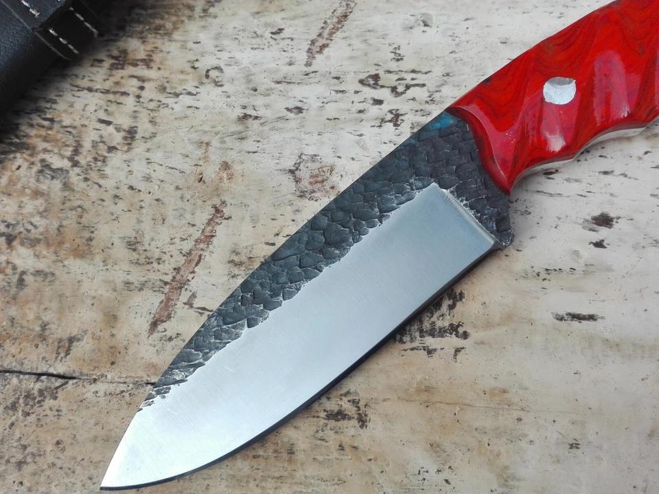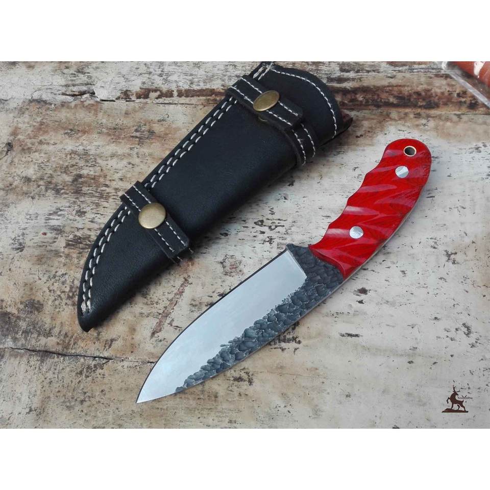 ด้ามจับไม้และปลอกหนังมีใบมีดสกินเนอร์ทำด้วยมือเหล็กคาร์บอนตามสั่ง