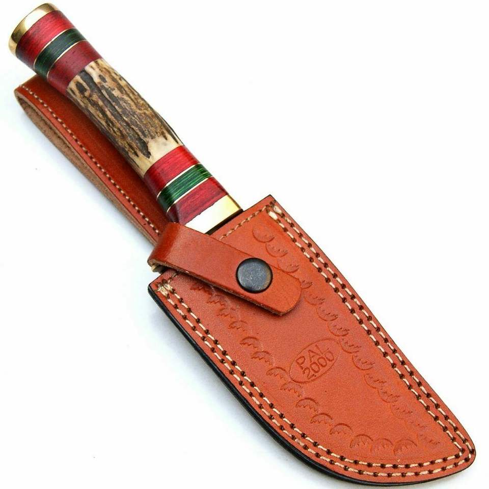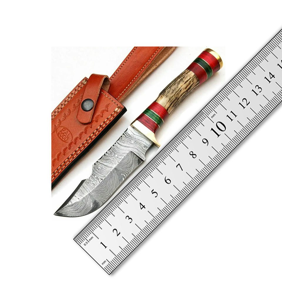 มีดล่าสัตว์แบบมีปลอกหนังมีดเหล็กดามัสกัสแบบกำหนดเองทำด้วยมือ