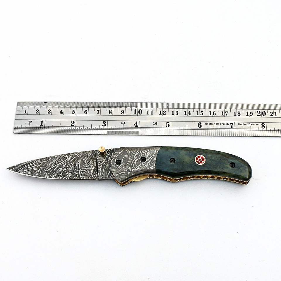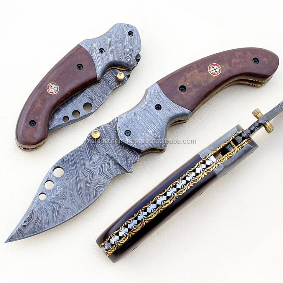 มีดพับพกพาเหล็กดามัสกัสทำด้วยมือพับได้ใบมีดไม้ใช้งานในอุตสาหกรรมงานหนัง