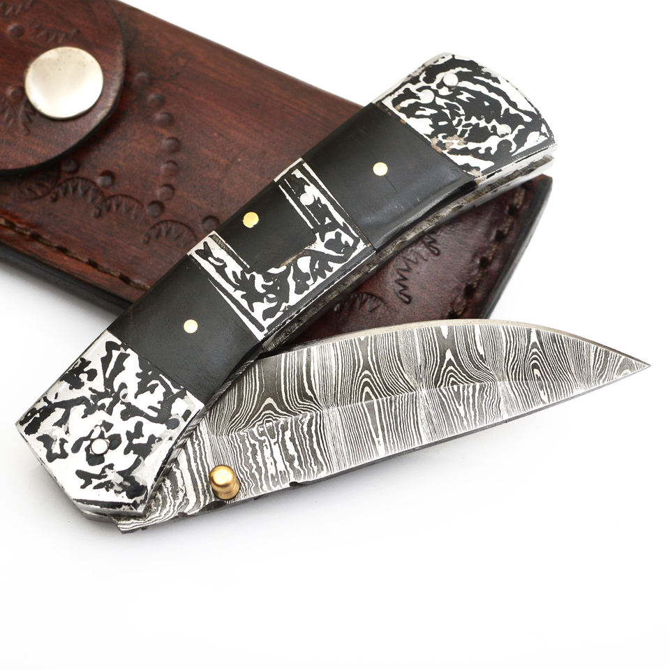 มีดพกเหล็กดามัสกัสทำด้วยมือพร้อมด้ามจับฮอร์นและปลอกหนังชั้นดีมีด EDC พับได้สำหรับตั้งแคมป์