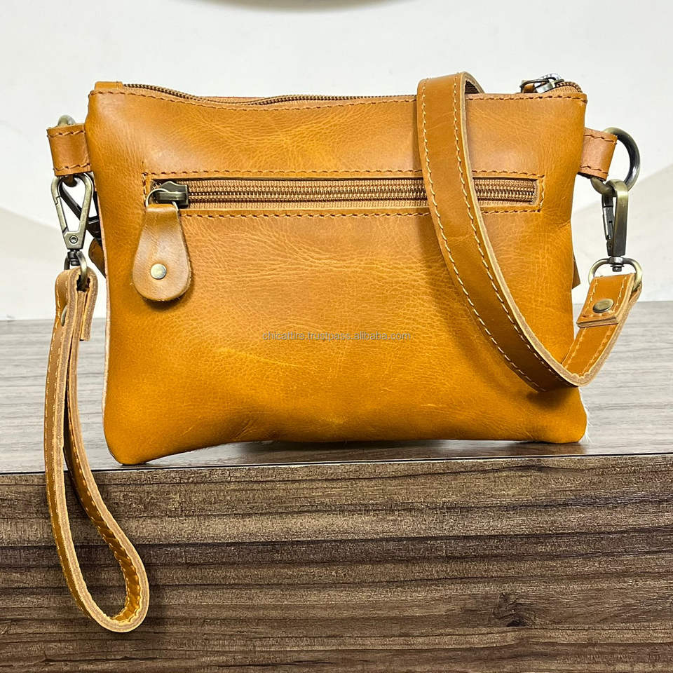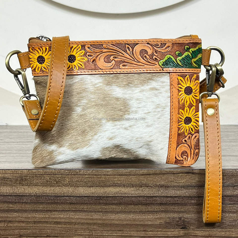 กระเป๋าถือหนังวัวพร้อมสายคล้องข้อมือปรับขนาดได้กระเป๋าใบเล็กสำหรับผู้หญิงดีไซน์ดอกทานตะวันทำด้วยมือออกแบบได้ตามต้องการ