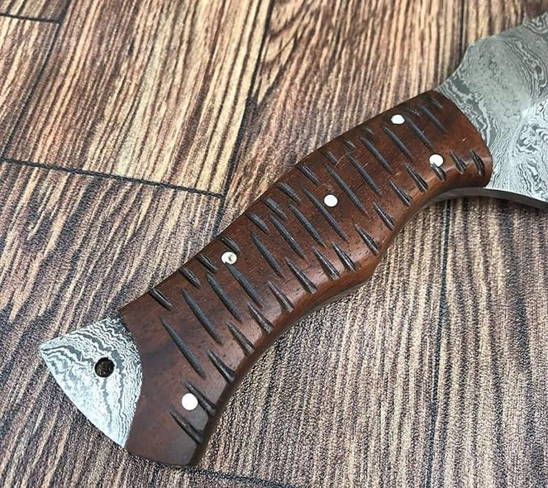 มีดใบตายเหล็กกล้าไร้สนิมเกรดอุตสาหกรรม งานแฮนด์เมด ปรับแต่งได้ ขอบหยัก ปลายคลิป ด้ามไม้โรสวูด ลายวัวกระทิง