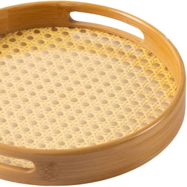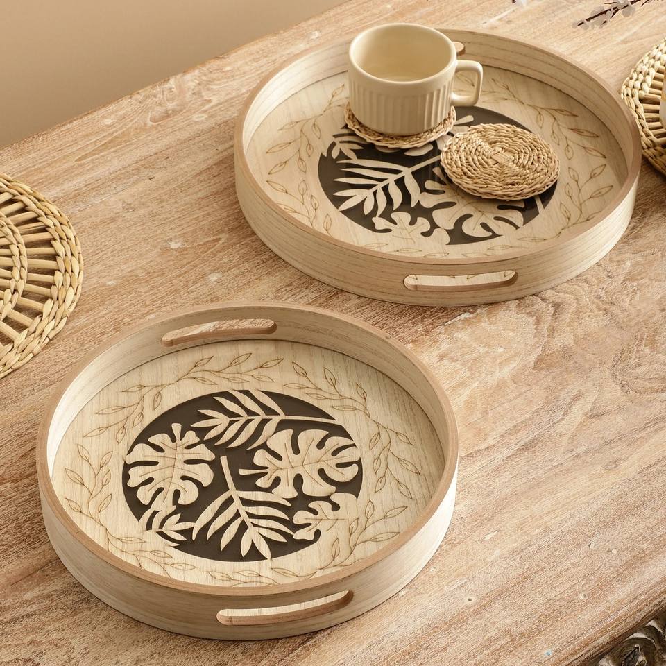 ถาดไม้ทรงกลมแบบใช้แล้วทิ้งเป็นมิตรต่อสิ่งแวดล้อมสำหรับตกแต่งห้องครัวและใช้ใส่อาหาร