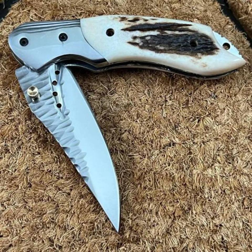 มีดพับทำมือเหล็ก D2 สำหรับตั้งแคมป์ ด้ามเขาสัตว์ มีปลอกหนัง รับผลิตแบบ OEM ใช้พกพาได้ทุกวัน