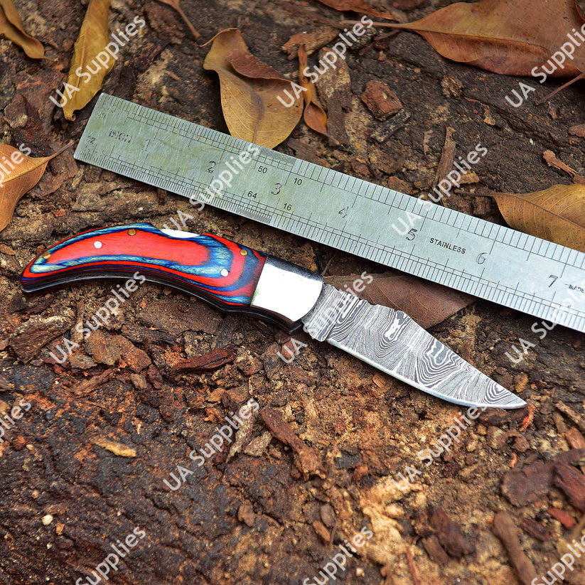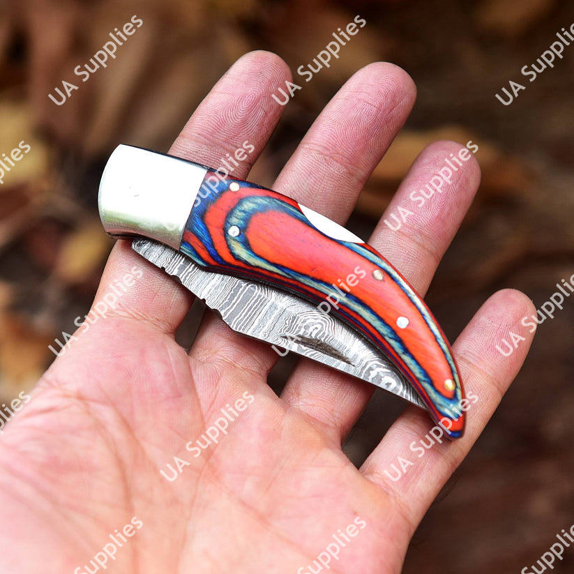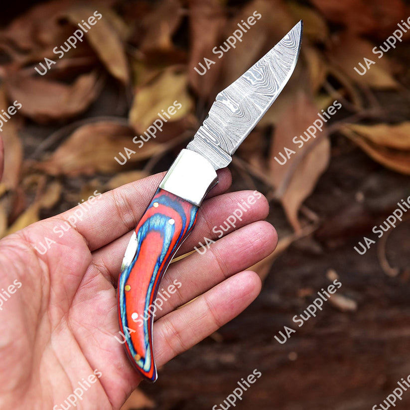 มีดพับเหล็กดามัสกัสทำมือ DIY แบบ Drop Point พร้อมปลอกหนัง ล็อคด้านหลัง ปรับแต่งได้ตามต้องการ ขายส่งสำหรับการล่าสัตว์ ด้ามจับทำจากไม้ Pakka