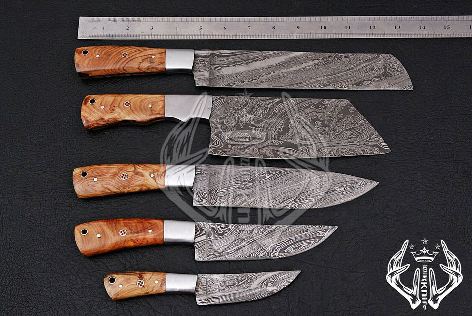 ชุดมีดเชฟสแตนเลส100% ดามัสกัสทำด้วยมือมีดทำครัวด้ามไม้ดีไซน์ตามสั่งพิมพ์โลโก้ได้ตามต้องการ
