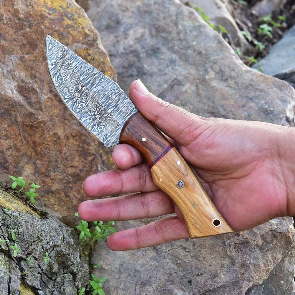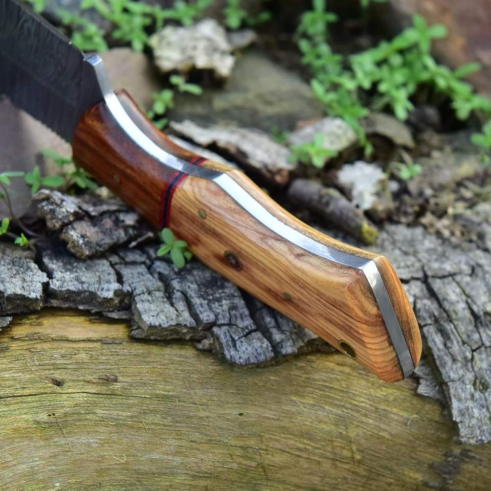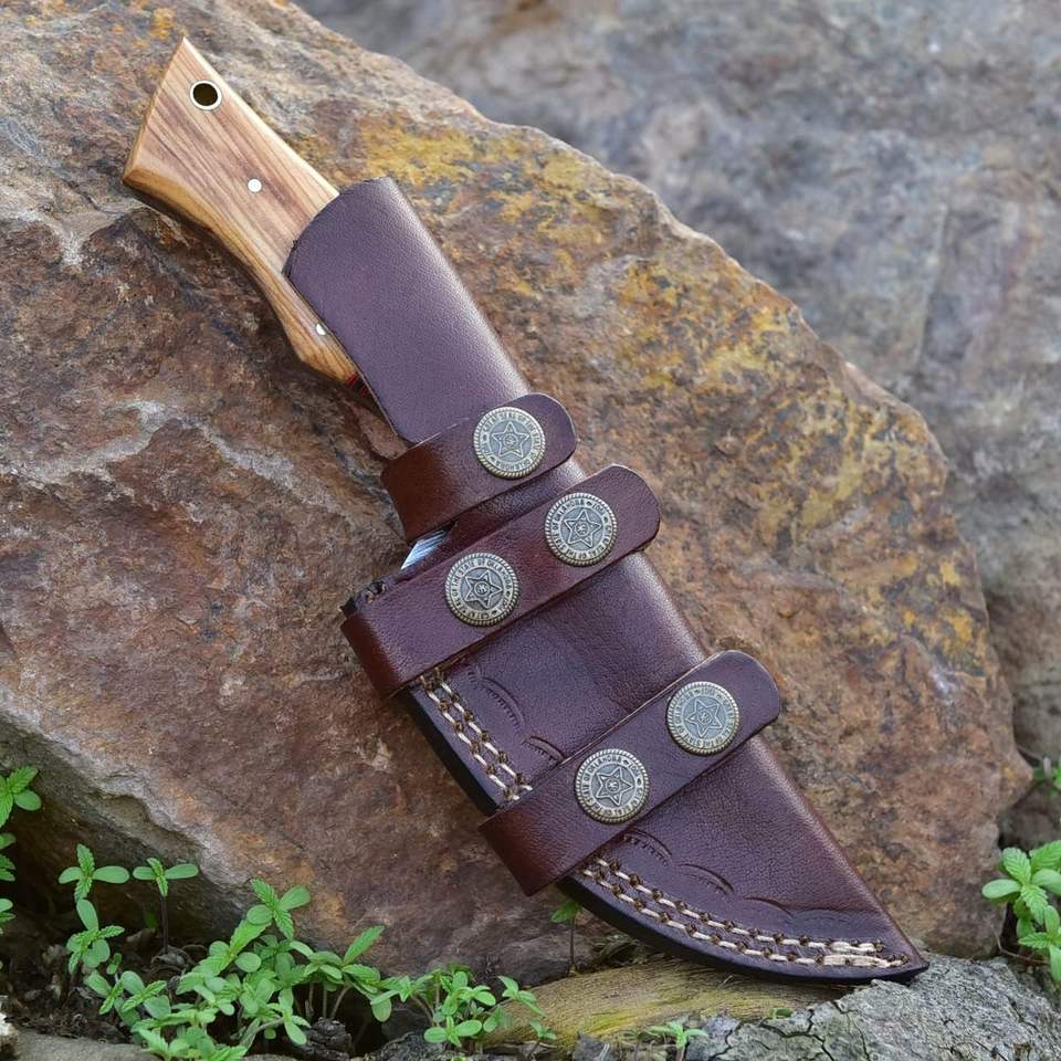 มีดล่าสัตว์ดามัสกัสทำด้วยมือคุณภาพสูงพร้อมปลอกหนังดีไซน์มีดสำหรับตั้งแคมป์แบบใบมีดคงที่