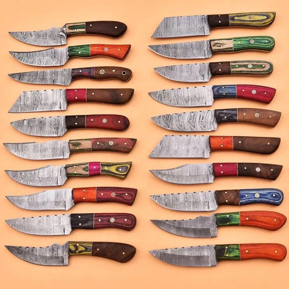 มีดทำมือจากเหล็กดามัสกัส ชุด 20 ชิ้น – ด้ามไม้ผสมผสาน ปลอกหนัง ของขวัญสำหรับเขา