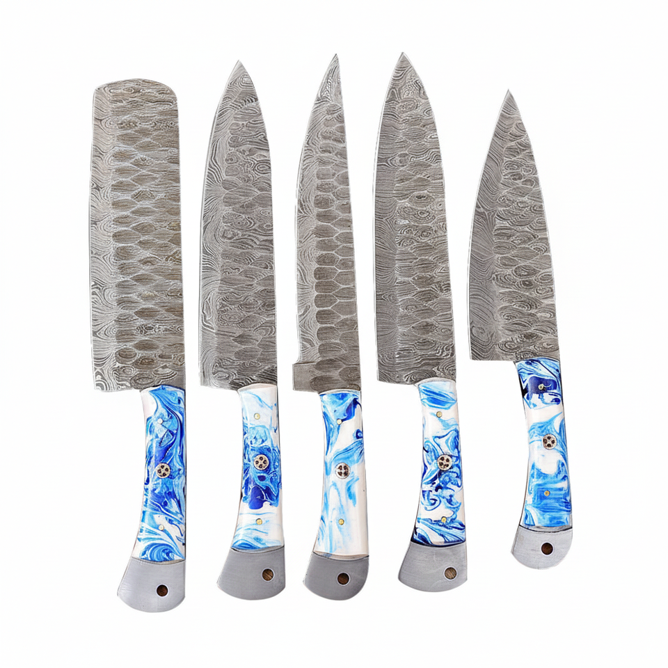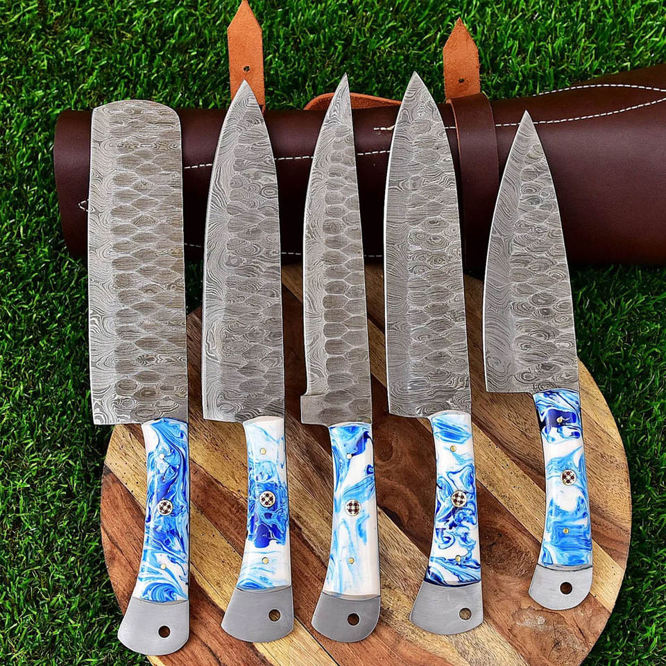 ชุดมีดทำครัวเหล็กดามัสกัส5ชิ้นทำด้วยมือทำจากหนังแท้ชุดมีดเชฟดามัสกัสขนาดตามสั่ง