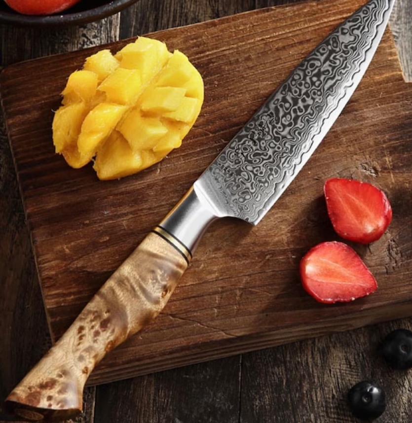 ชุดเครื่องครัว 5 ชิ้น ทำมือ เป็นมิตรกับสิ่งแวดล้อม ผลิตจากเหล็กกล้าคาร์บอนดามัสกัส พร้อมปลอกหนัง ประกอบด้วยมีดเชฟ มีดปังตอ มีดหั่นขนมปัง มีดสเต็ก มีดหั่นผลไม้