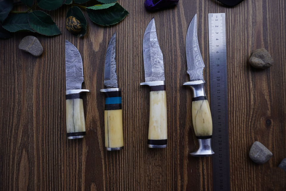 ชุดมีดเชฟเหล็กดามัสกัสทำมือ 5 ชิ้น ปลายแหลม ดีไซน์ใช้ได้ทั้งมือซ้ายและขวา ด้ามไม้ ลายเชื่อมเหล็ก