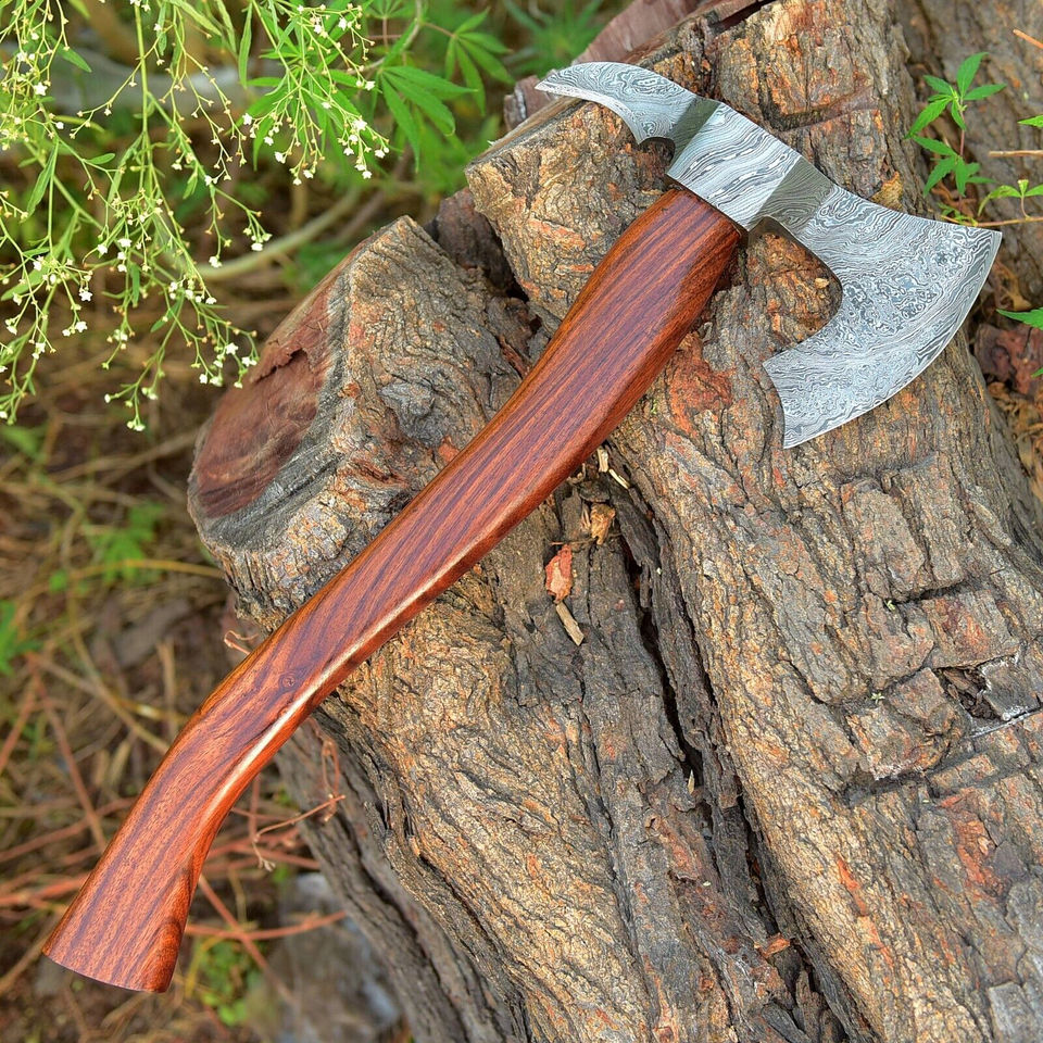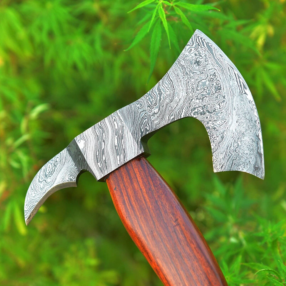 ขวานเหล็กดามัสกัสทำด้วยมือง่ายต่อการพกพาสำหรับตั้งแคมป์ด้ามไม้ด้ามจับสะดวกสบายจับเหล็กดามัสกัสขวานเหล็ก