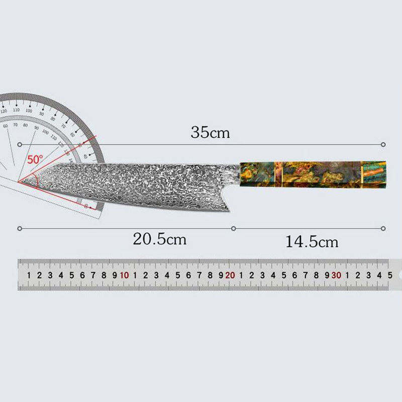 มีดเชฟเหล็กดามัสกัสทำมือ เคลือบเรซิ่นกันติด ใบมีดยาว 7 นิ้ว ใช้กับเครื่องล้างจานได้ เหมาะสำหรับหั่นผลไม้และผัก