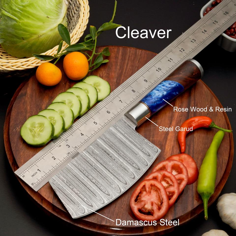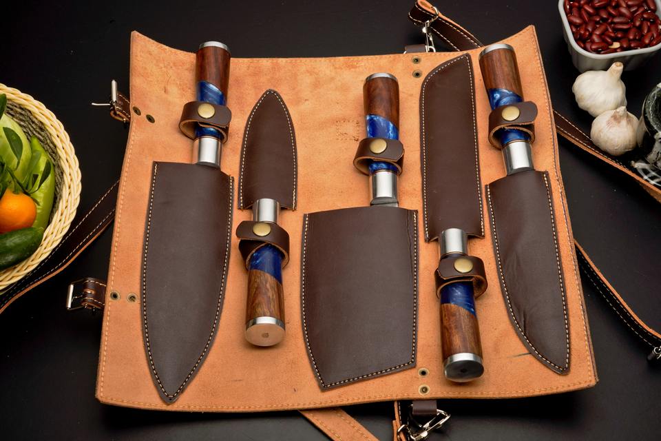 ชุดมีดเชฟเหล็กดามัสกัสทำมือ 5 ชิ้น ใบมีดตรง ใช้ได้ทั้งมือซ้ายและขวา ด้ามจับเรซิ่นไม้พะยูง ใบมีดยาว 5 นิ้ว