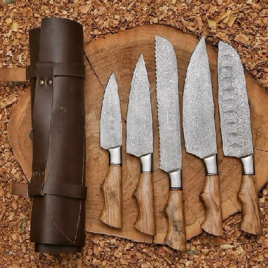 ชุดเชฟเหล็กดามัสกัสทำมือ5ชิ้นเคสหนังอย่างดีด้ามไม้มีดหั่นผักที่กำหนดเองพร้อมที่จับไม้มะกอก