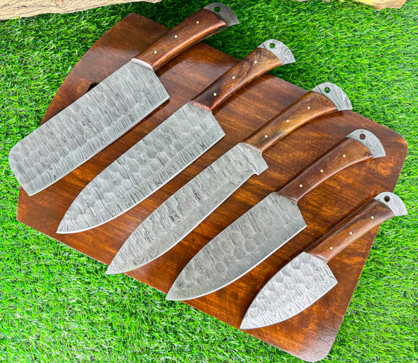 ชุดมีดทำครัว 5 ชิ้น ทำจากเหล็กดามัสกัส งานแฮนด์เมด เป็นมิตรกับสิ่งแวดล้อม พร้อมปลอกหนังแท้ ประกอบด้วยมีดเชฟ มีดสับ มีดสเต็ก และมีดผลไม้