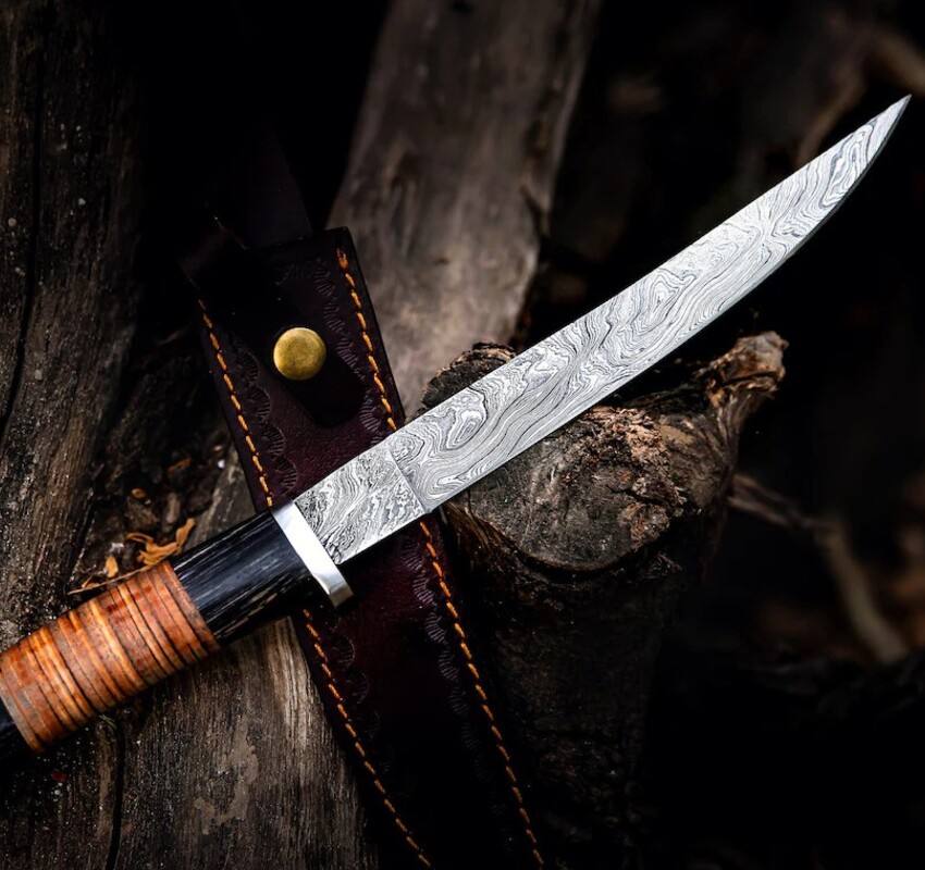 มีดแล่เนื้อเหล็กดามัสกัสทำมือ ด้ามไม้หุ้มหนัง มีดตกปลา คมกริบ พร้อมปลอกหนัง
