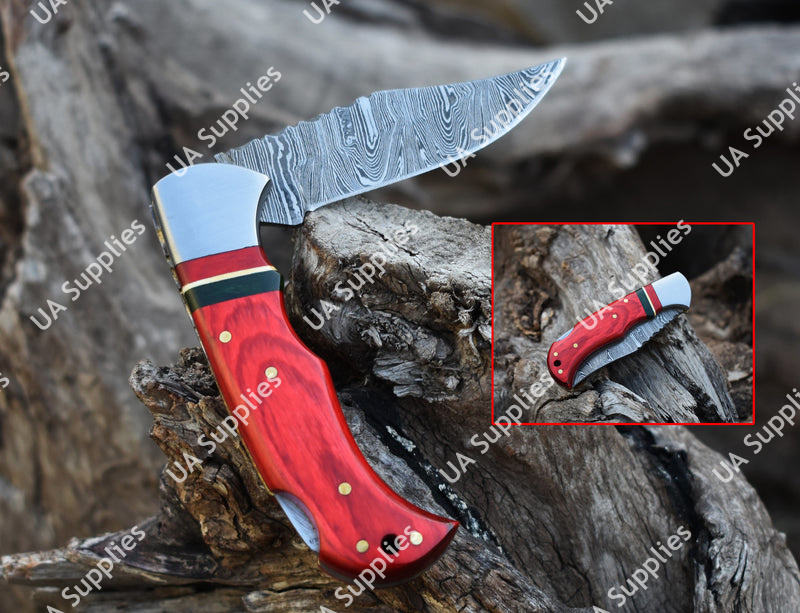 มีดพับเหล็กดามัสกัสทำมือระดับมืออาชีพ ระบบล็อคด้านหลัง รับผลิตแบบ OEM/ODM ด้ามไม้เคลือบอีพ็อกซี่ สำหรับยุทธวิธี พกพาประจำวัน และเอาตัวรอด ปลายมีดแบบ Drop Point ขนาด 7.5 นิ้ว