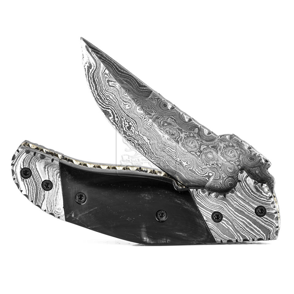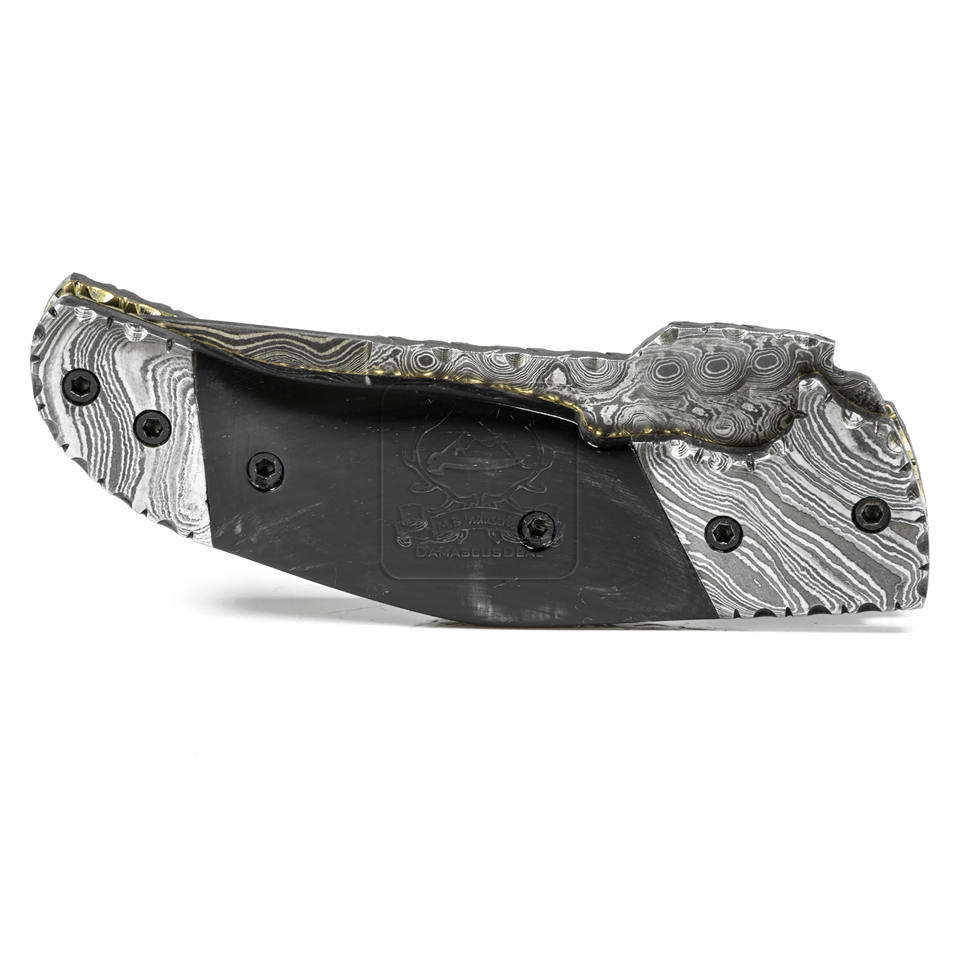 มีดพับเหล็กดามัสกัสแบบแฮนด์เมดมีดพกพกพาสแตนเลสสำหรับการล่าสัตว์และตั้งแคมป์กลางแจ้งพร้อมด้ามจับฮอร์นเหมือนดาบ