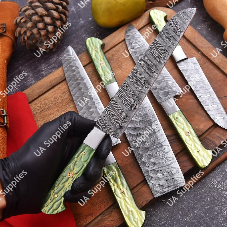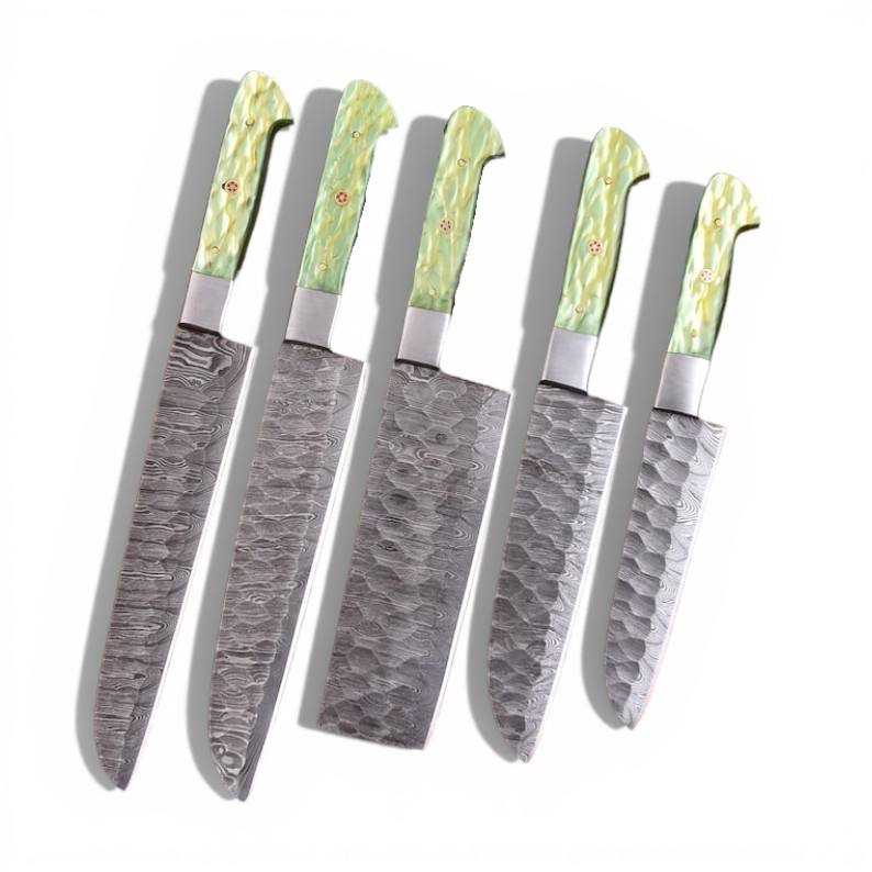 ชุดมีดทำมือเหล็กดามัสกัสแบบเต็มด้าม 5 ชิ้น สำหรับเชฟบาร์บีคิว ระดับมืออาชีพ ใช้ได้ทั้งมือซ้ายและขวา พร้อมปลอกหนัง