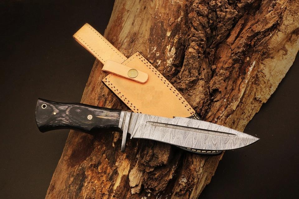 มีดล่าสัตว์เหล็กดามัสกัสแบบทำด้วยมือมีดดามัสกัสเต็มรูปแบบพร้อมปลอกหนัง