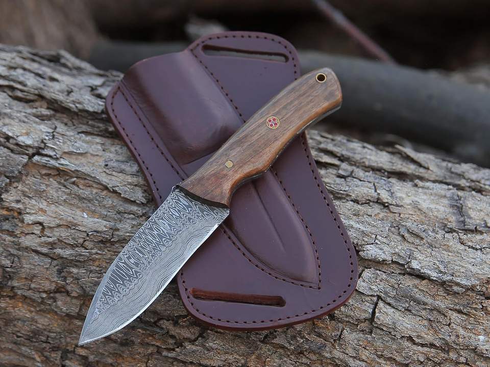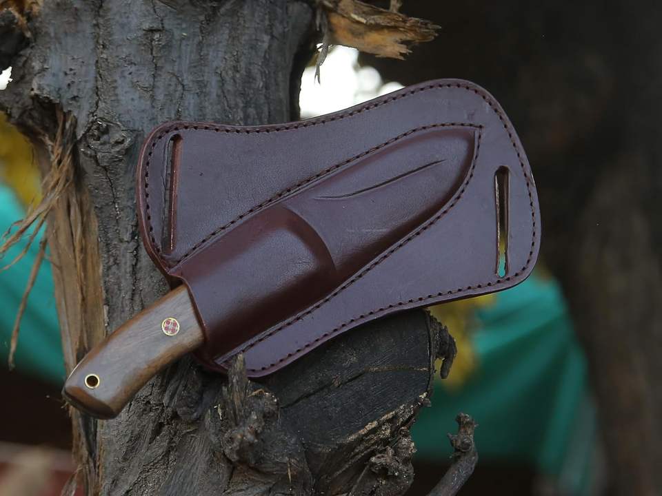 มีดล่าสัตว์ทำด้วยมือด้ามไม้วอลนัทพร้อมปลอกหนังมีดสำหรับตั้งแคมป์สไตล์คาวบอย