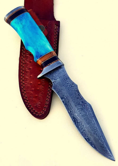 มีดเหล็กดามัสกัสทำด้วยมือพร้อมที่จับสีกระดูกล่าสัตว์มีดโบวี่มีดปลอก