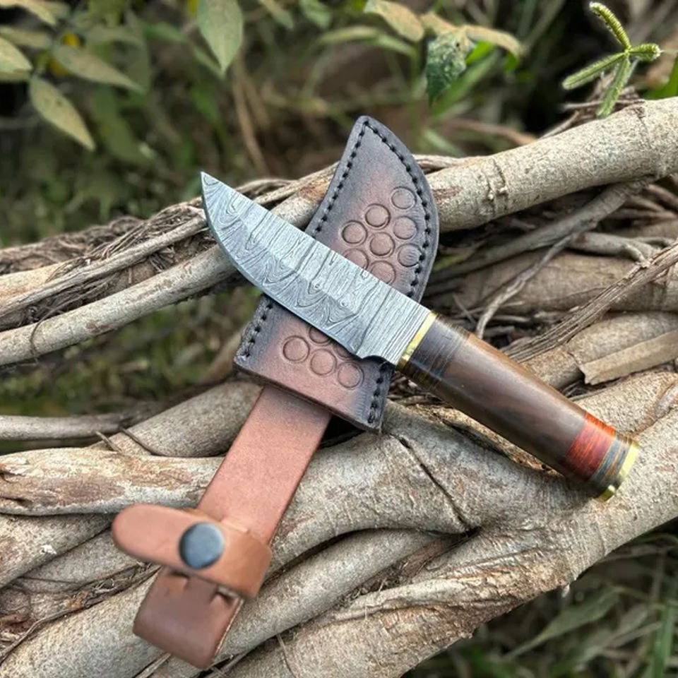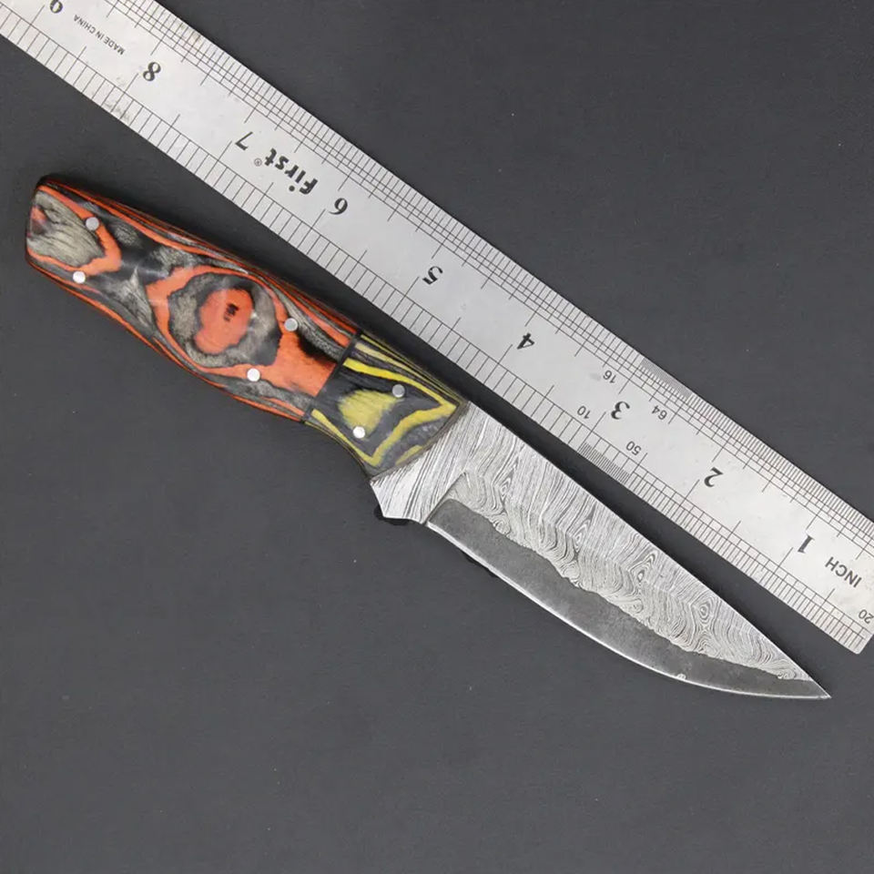 มีดเหล็กดามัสกัสทำมือ ด้ามไม้และเหล็ก พร้อมปลอกหนัง สำหรับกิจกรรมกลางแจ้งและตั้งแคมป์