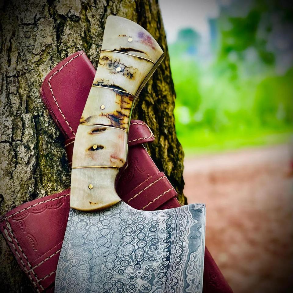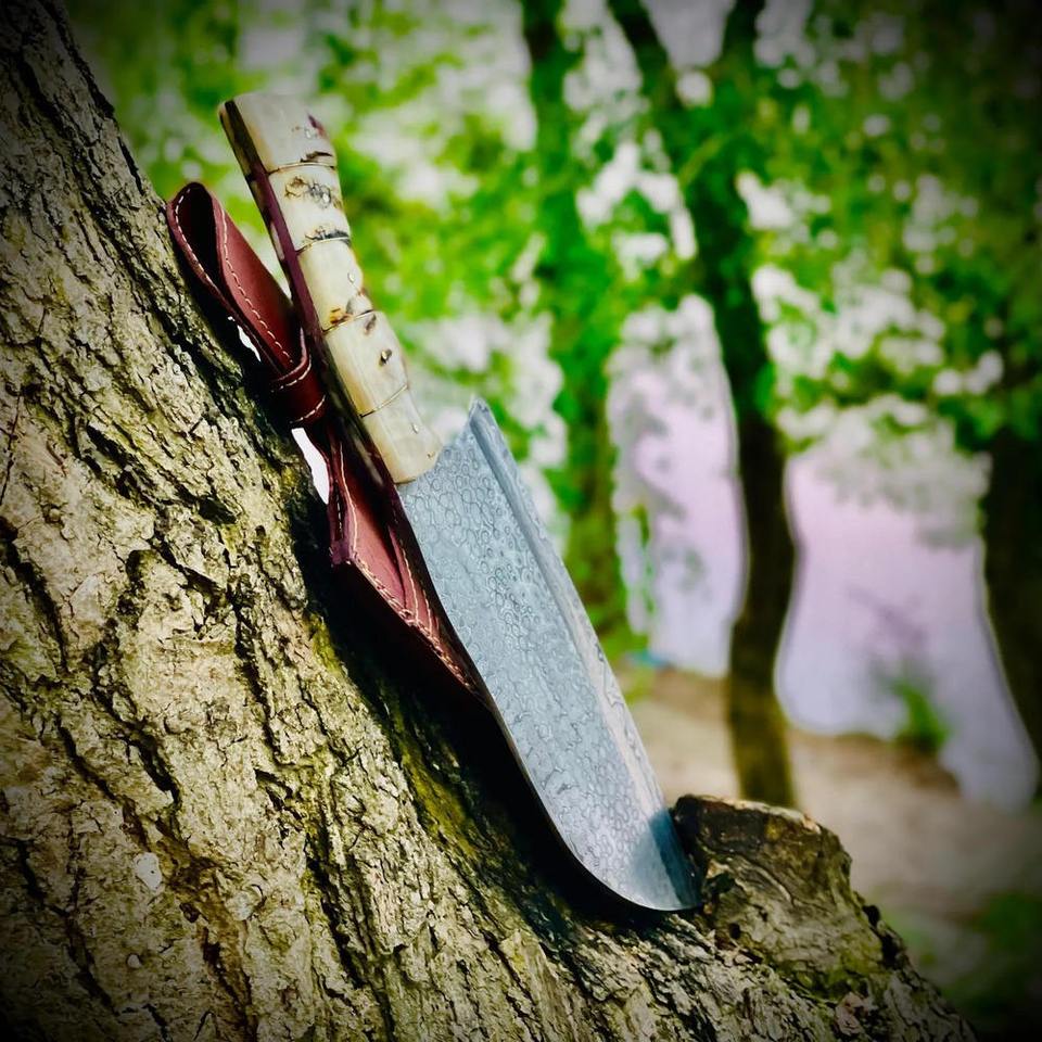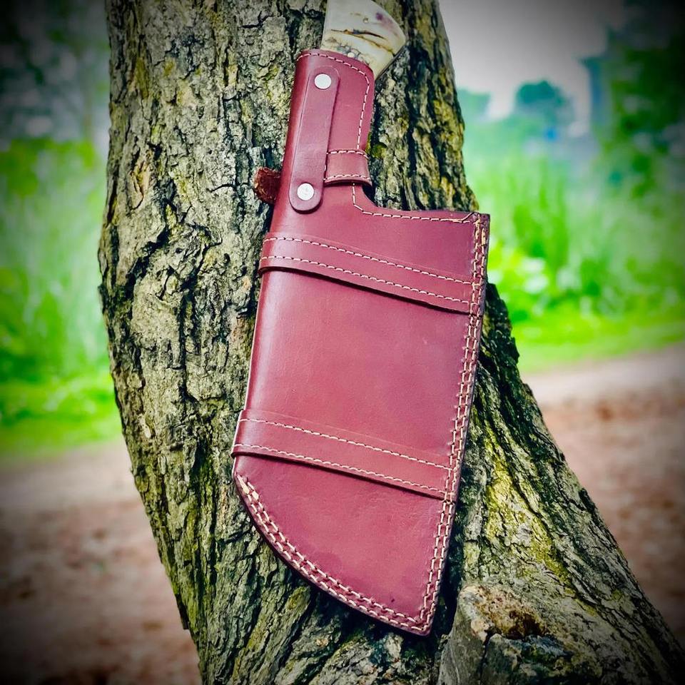 Handmade Damascus Steel Serbian Cleaver Knife Ram Horn Handle with Comfortable Handle Grip Free Leather Sheath Kitchen Knife