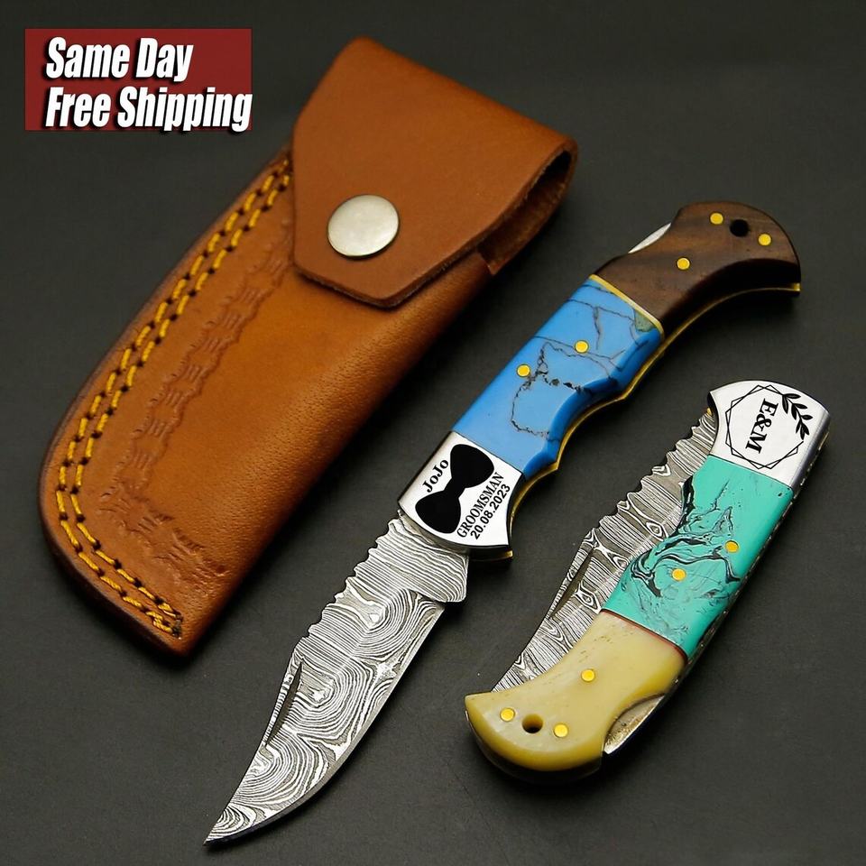 มีดพกเหล็กดามัสกัสแบบเลื่อนได้3 "ทำด้วยมือมีดสลักโลโก้ตามสั่ง