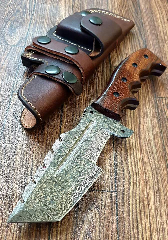มีดติดตามเหล็กดามัสกัสทำด้วยมือจับที่สมบูรณ์แบบพร้อมที่จับไม้สีดำกุหลาบและปลอกหนัง