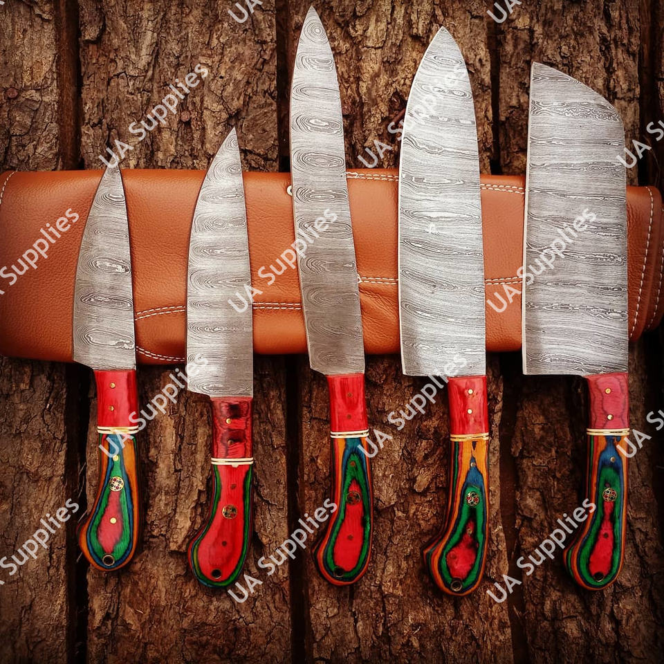 ชุดมีดเชฟมืออาชีพ 5 ชิ้น ทำจากเหล็กดามัสกัสแท้ ลายบิดเกลียว ด้ามไม้ปักก้า รับผลิตแบบ OEM/OBM ปรับแต่งได้