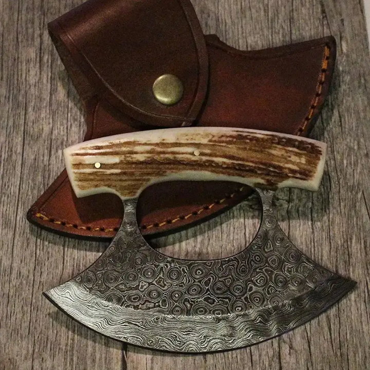 มีดเชฟเหล็กดามัสกัสทำมือสำหรับใช้ในครัวพร้อมเขากวางเขากวางสำหรับเครื่องมือทำพิซซ่า