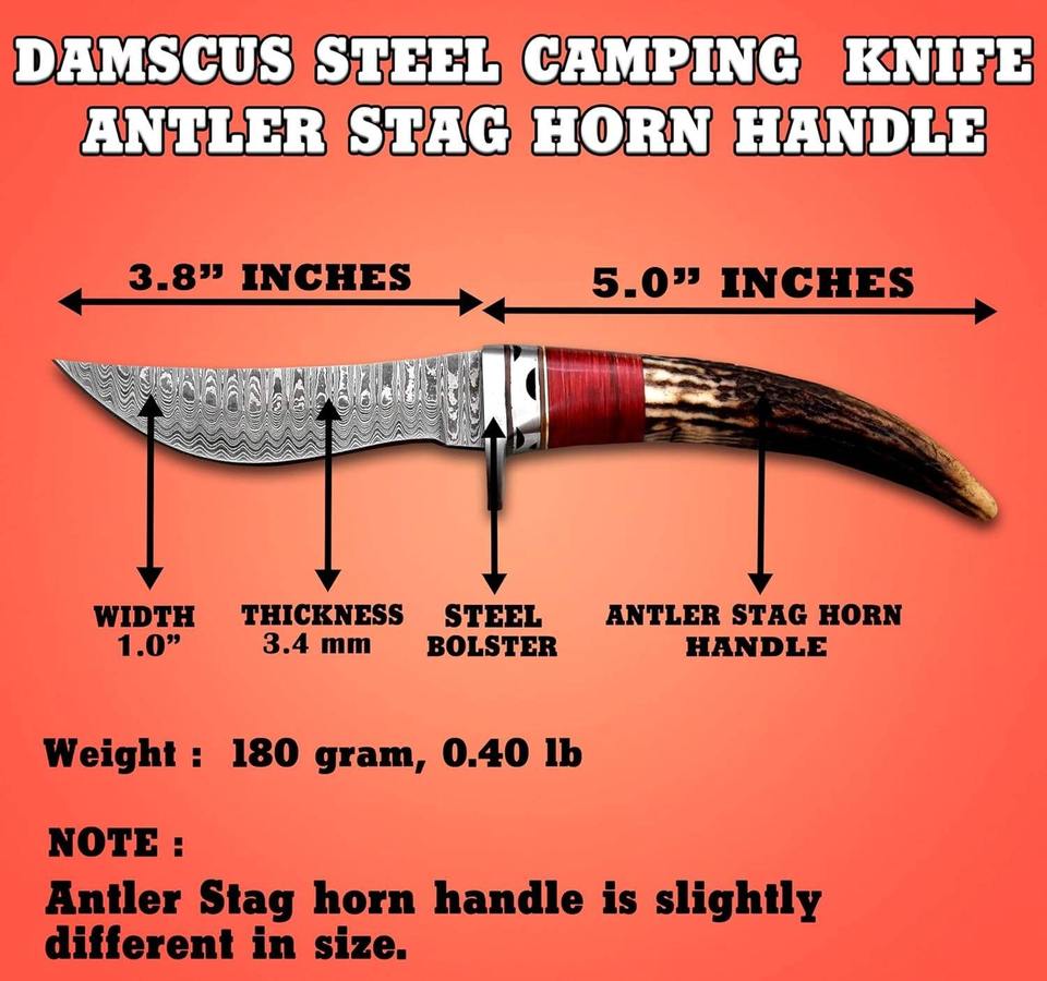 มีดทำมือจากเหล็กดามัสกัส สำหรับล่าสัตว์และเอาตัวรอด ด้ามทำจากเขาสัตว์ สำหรับกิจกรรมกลางแจ้ง OEM 56HRC ปลายมีดแบบ Drop Point คมกริบ