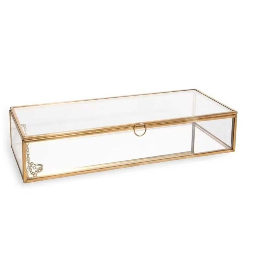 กล่องเก็บของตกแต่งทำมือจากทองเหลืองและแก้ว กล่องโชว์เครื่องประดับโลหะสีทอง กล่องใส่ของที่ระลึกแก้วใส ฝาปิดแบบมีบานพับและสายโซ่