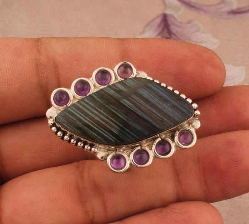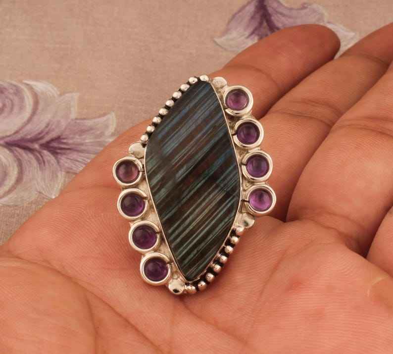 925จากนักออกแบบทำด้วยมือแหวนเงินสเตอร์ลิงสายลาบราดอไรต์ธรรมชาติพร้อมหนามเตยเครื่องประดับอัญมณีที่ไม่เหมือนใคร