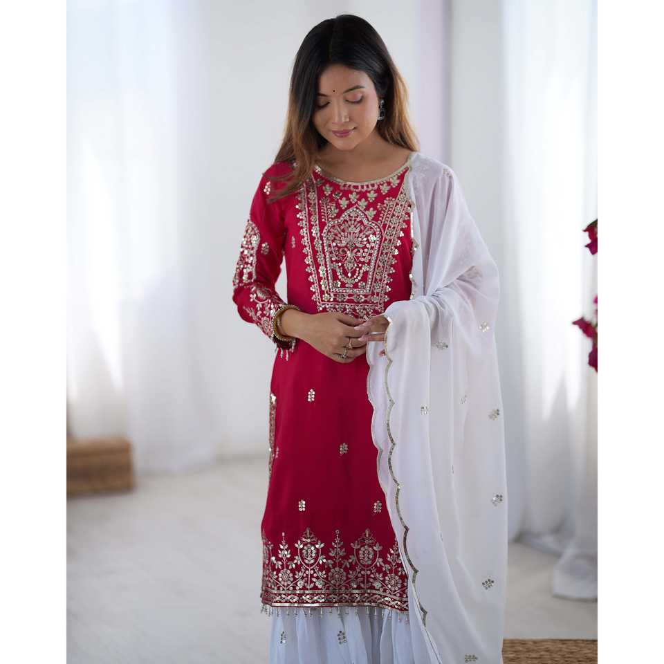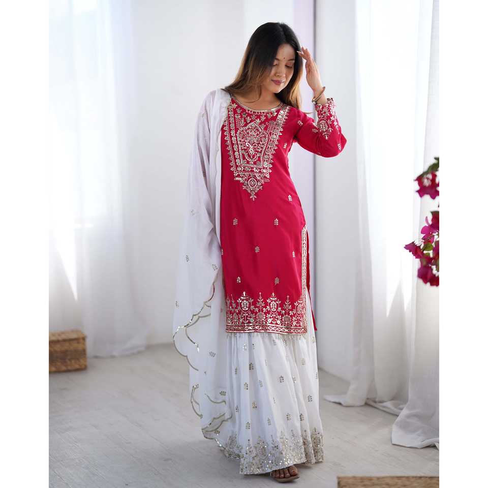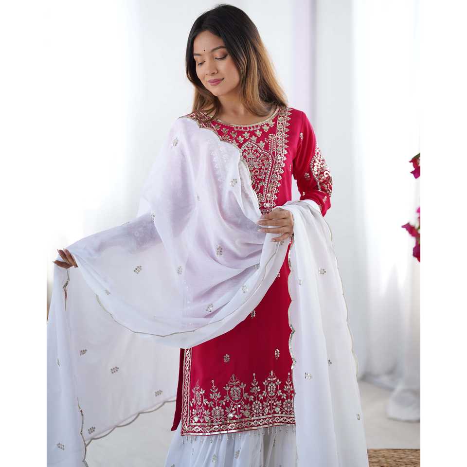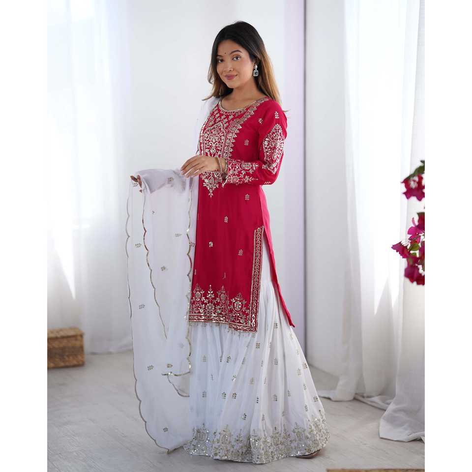 ชุดงานปักมือดีไซน์เนอร์บนผ้าออร์แกนซ่า พร้อมกางเกงทรงปล่อยและผ้าคลุมไหล่ เหมาะสำหรับงานปาร์ตี้ ดีไซน์เอวธรรมชาติ งานปักมือประณีต