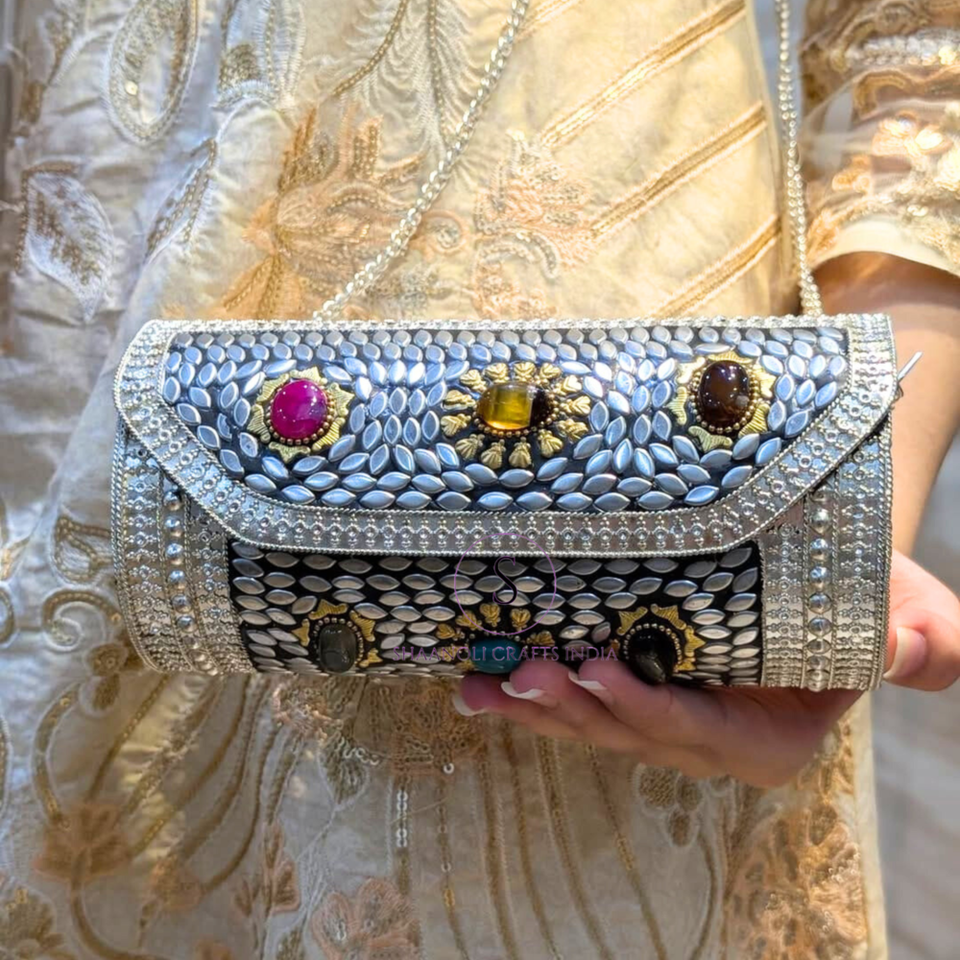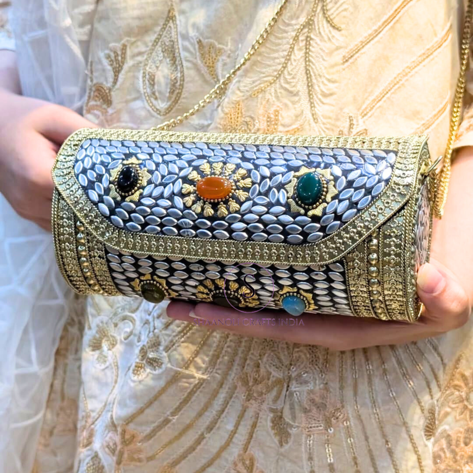 กระเป๋าคลัทช์งานฝีมือดีไซน์เนอร์ประดับโลหะโมเสค งานฝังหินและอัญมณีสวยงาม สำหรับงานแต่งงานและงานเลี้ยง