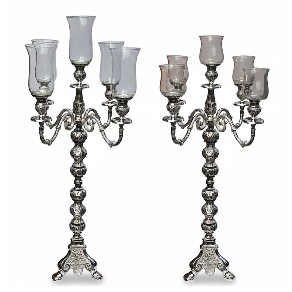เชิงเทียนอะลูมิเนียมดีไซน์ทำมือ ตกแต่งสีเงิน 5 แขน พร้อมแก้วใสสำหรับใส่เทียนหอม เหมาะสำหรับตกแต่งบ้านในช่วงคริสต์มาสและงานปาร์ตี้