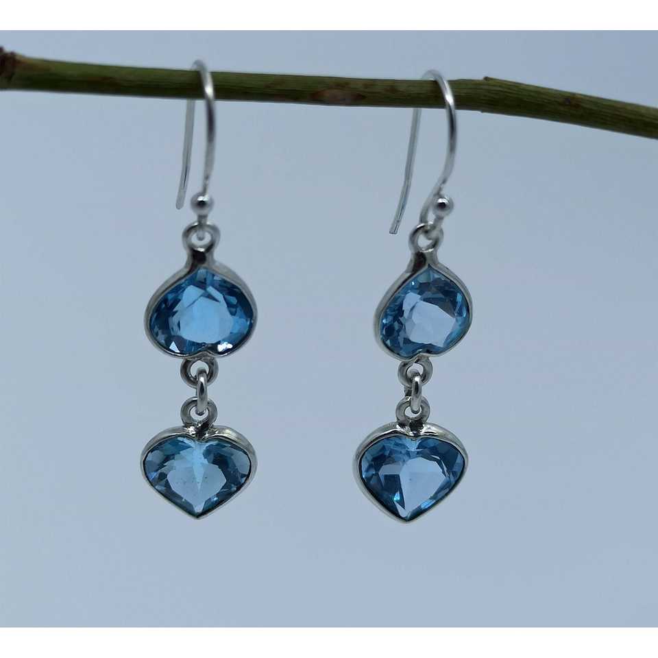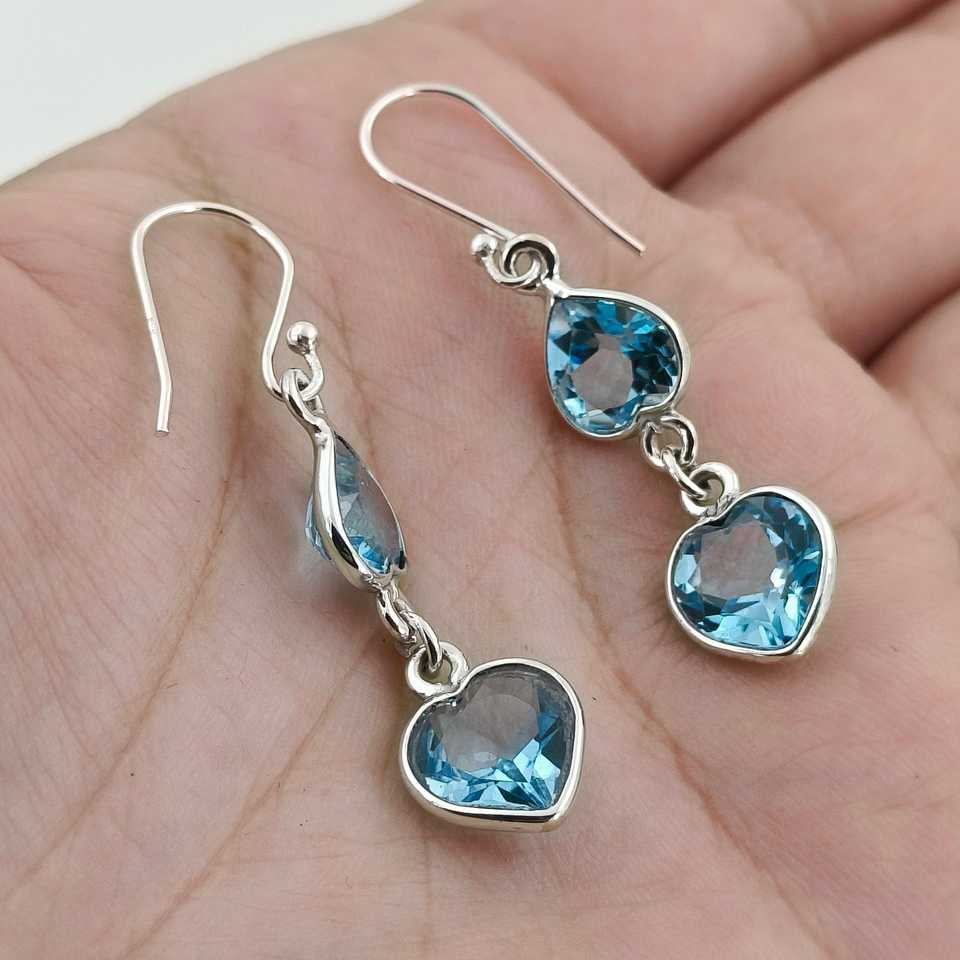 ต่างหูเงินแท้รูปหัวใจคู่ทำมือ ประดับพลอยบลูโทแพซธรรมชาติ ของขวัญวันครบรอบวันเกิดสำหรับเธอ แฟชั่นสำหรับผู้หญิง
