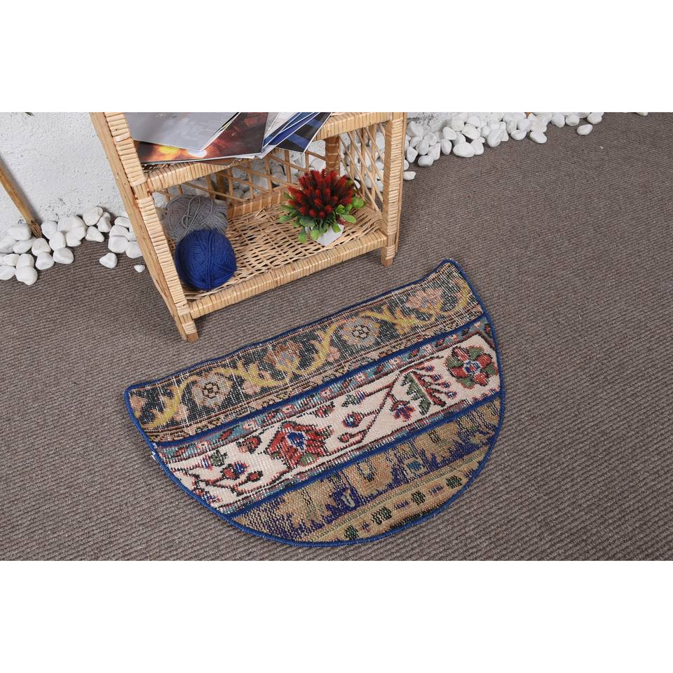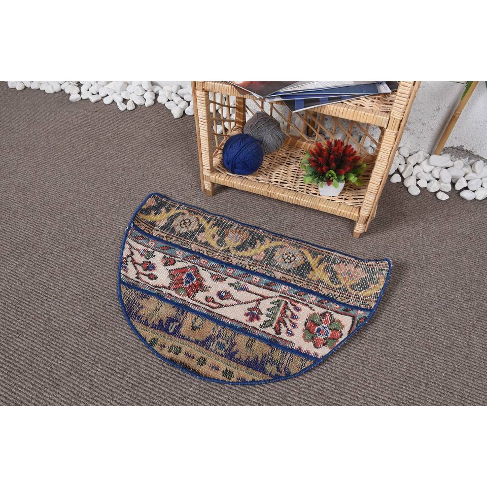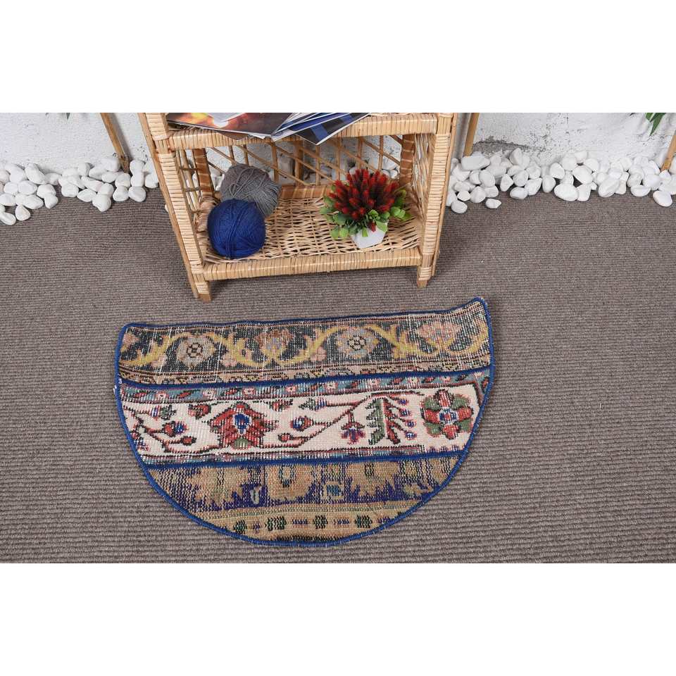 พรมทำมือ รักษ์โลก สไตล์วินเทจ คลาสสิก สีน้ำเงิน ทำจากขนสัตว์และยางพารา แบบปะติดปะต่อ ขนาด 2.5 x 1.5 ฟุต รูปทรงครึ่งวงกลม ขนปานกลาง เหมาะสำหรับห้องรับประทานอาหาร