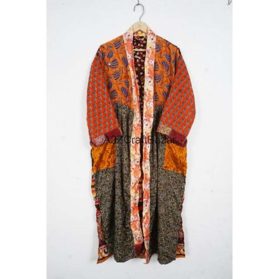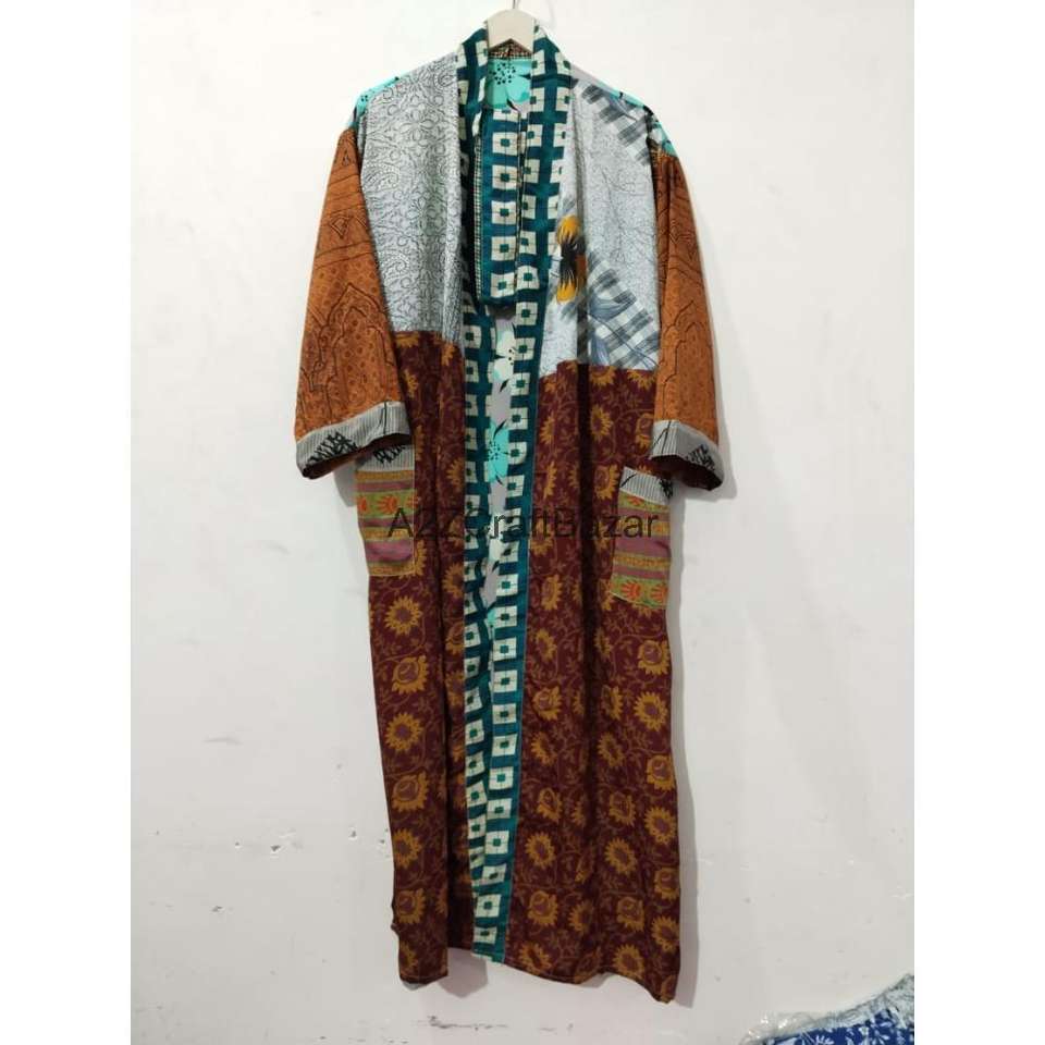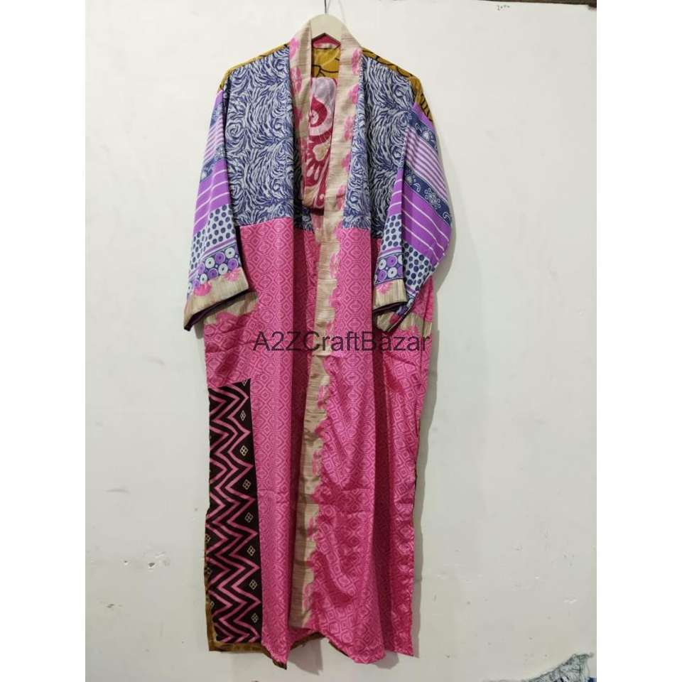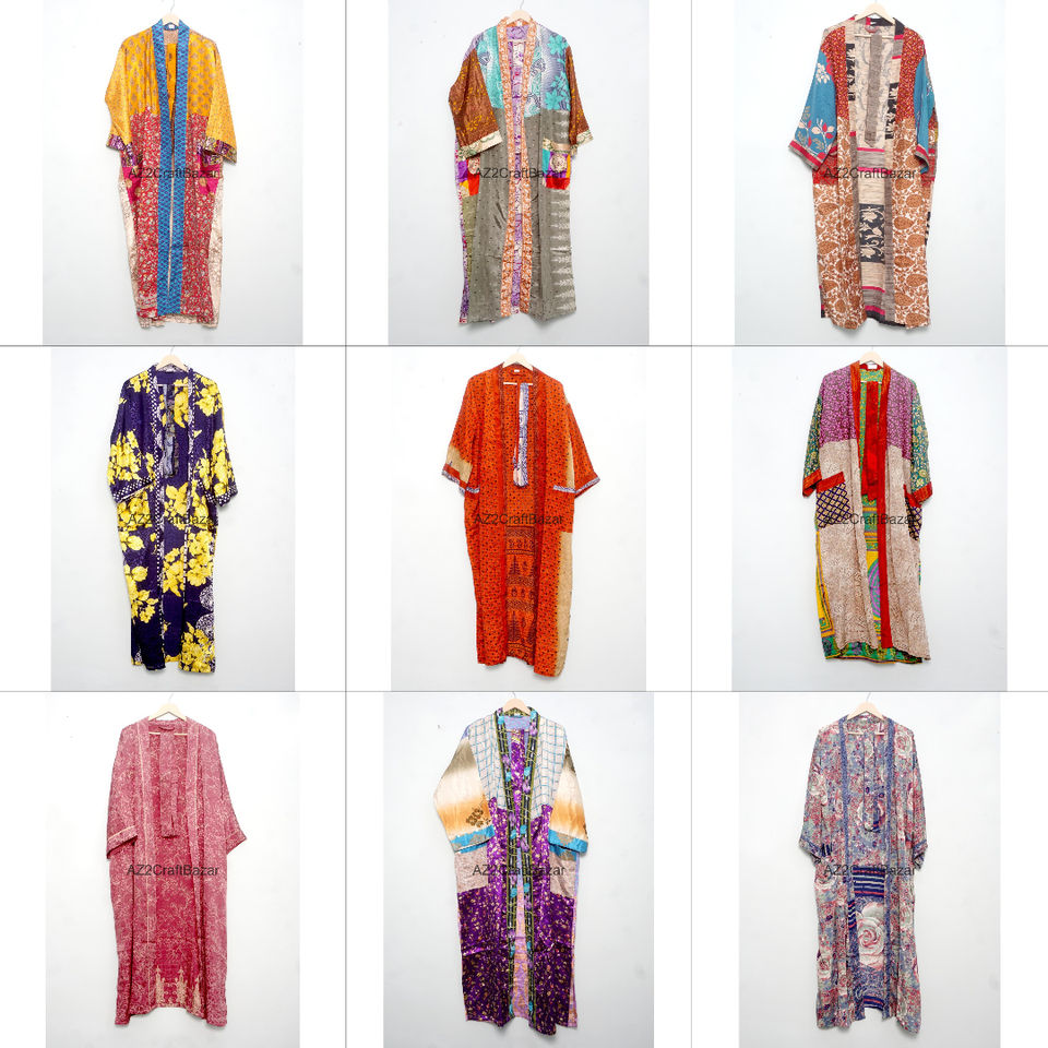 ชุดกิโมโนผ้าไหมแท้ 100% งานแฮนด์เมด ดีไซน์หรูหรา ตกแต่งด้วยผ้าปะติดปะต่อ สไตล์โบฮีเมียน เหมาะสำหรับคลุมอาบน้ำหรือใส่ไปชายหาด คอวี ปิดด้วยเชือกผูก แบบเต็มตัว