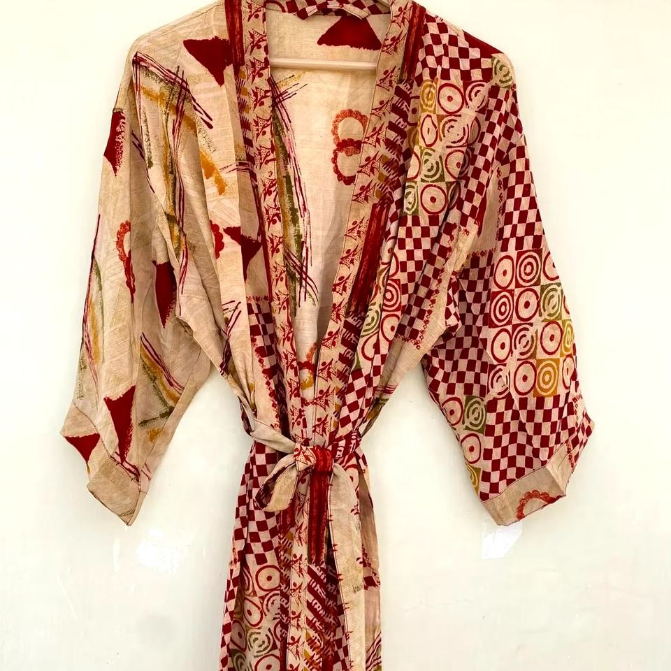 ชุดกิโมโนผ้าไหมสไตล์วินเทจของผู้หญิงชุดนอนผ้าชีฟองส่าหรีสำหรับฤดูใบไม้ผลิฤดูร้อนทำด้วยมือหรูหรา