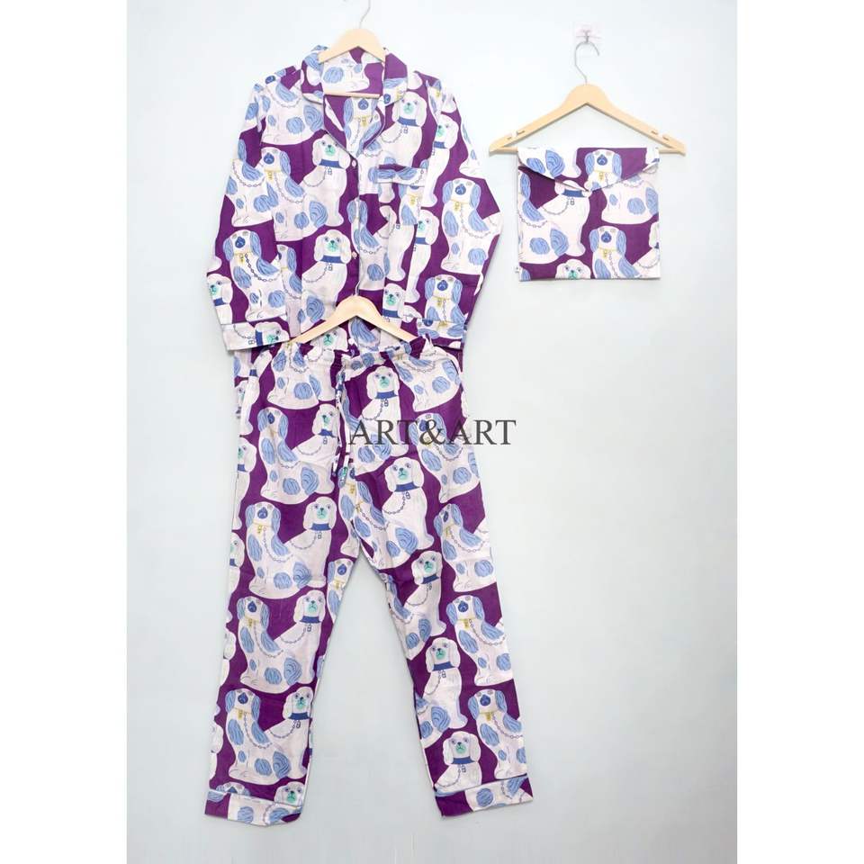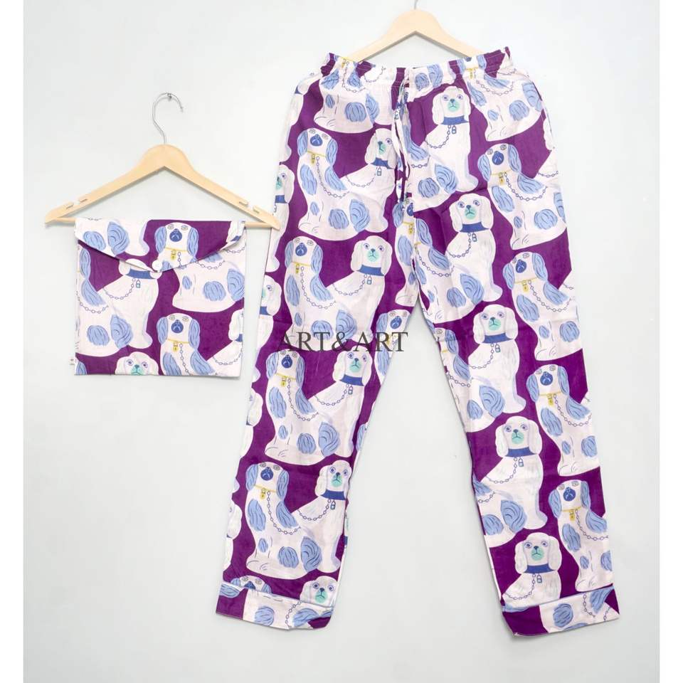 Handmade Elegant and beautiful cute dog print Women's Pajamas Set 100%Cotton Elastic Waist Floral Long Sleeve Full Length