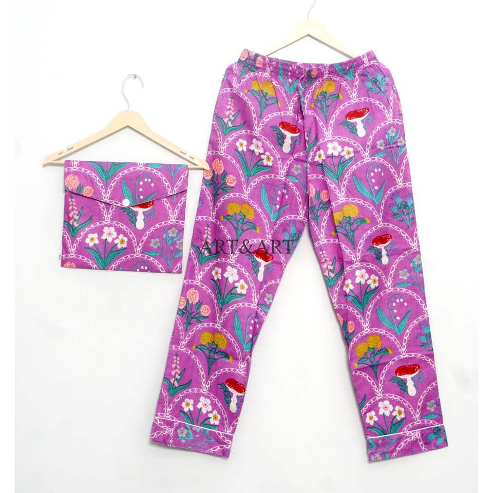 ชุดนอนผู้หญิงลายดอกไม้น่ารัก สวยงาม หรูหรา ทำด้วยมือ ผ้าฝ้าย 100% เอวยางยืด แขนยาว ขายาวเต็มตัว