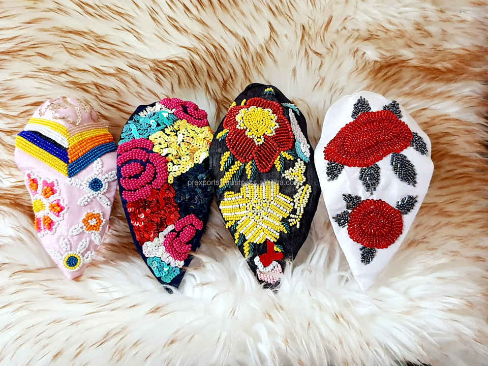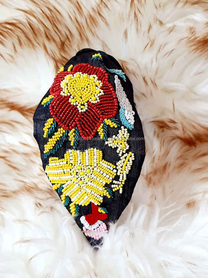 ผ้าคาดผมและยางรัดผมทำมือ ปักลาย ประดับลูกปัด เป็นมิตรกับสิ่งแวดล้อม น้ำหนักเบา ทนทาน ใช้ได้ทั้งชายและหญิง ชุดสีเหลืองลายดอกไม้หลากสี