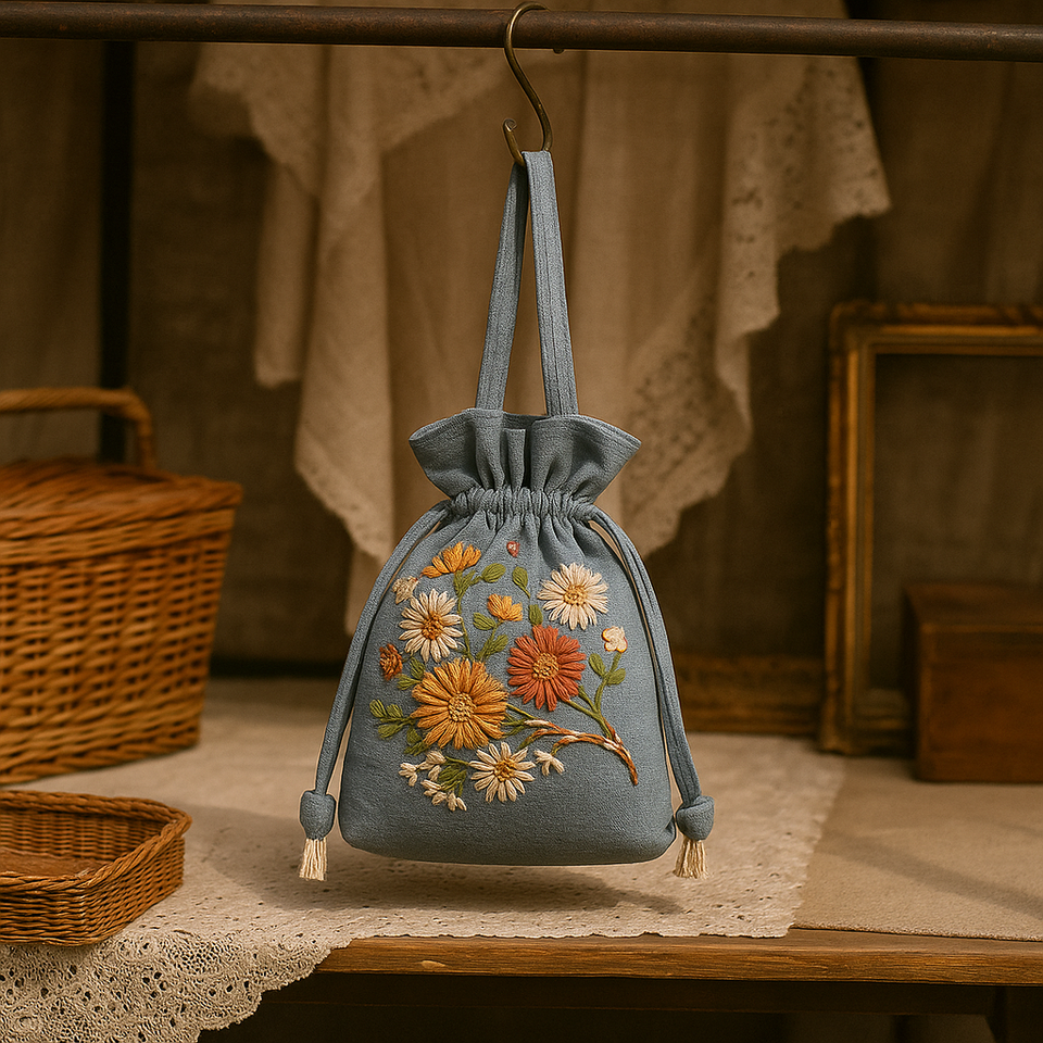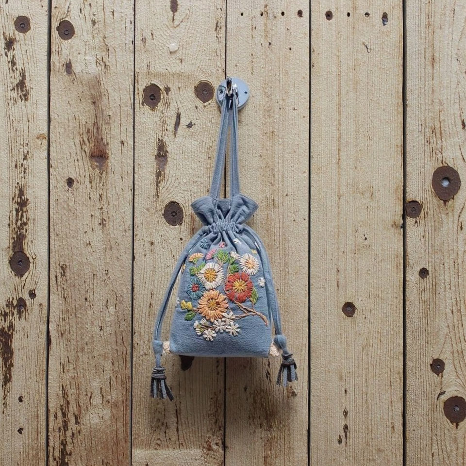 กระเป๋าเชือกรูดปักลายดอกไม้ทำด้วยมือกระเป๋าสะพายไหล่ผ้าฝ้ายโบโฮ