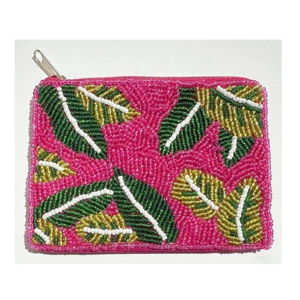 กระเป๋าใส่เหรียญผ้าปักลายใบไม้สีเขียวทำมือ ประดับลูกปัดเล็กๆ ปิดด้วยซิปด้านบน ดีไซน์สร้างสรรค์ ขนาดเล็ก กระเป๋าเก็บเหรียญ