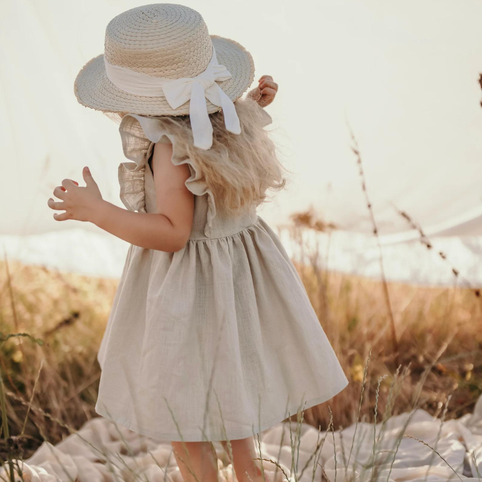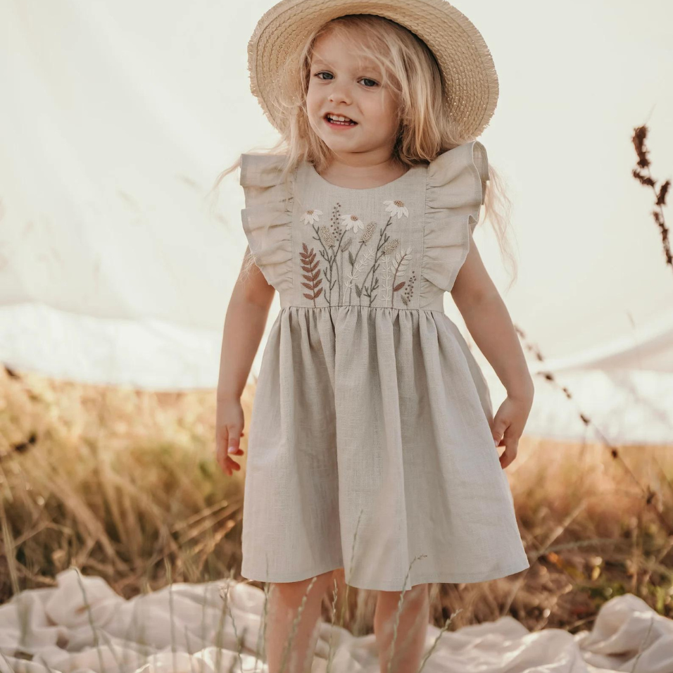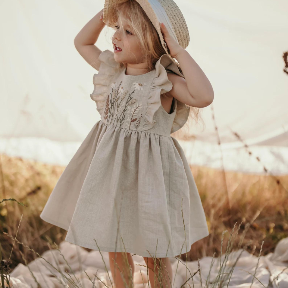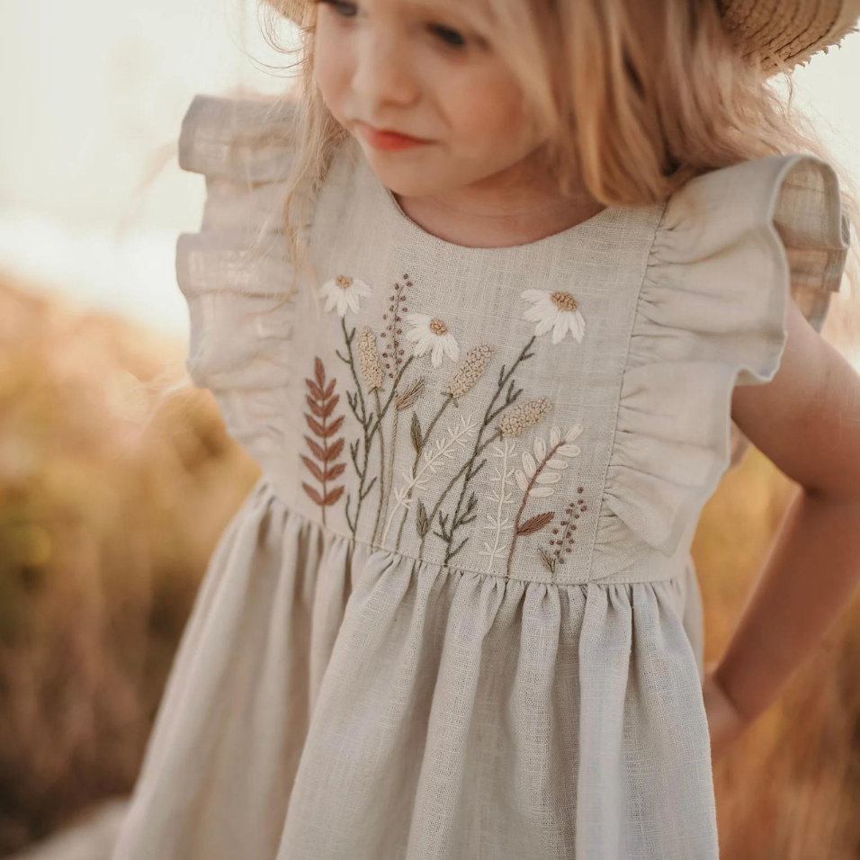 ชุดเดรสผ้าลินินปักทำด้วยมือสำหรับเด็กผู้หญิงสไตล์ลำลองสำหรับวันเกิดครั้งแรกของเด็กวัยหัดเดินผลิตในเวียดนาม